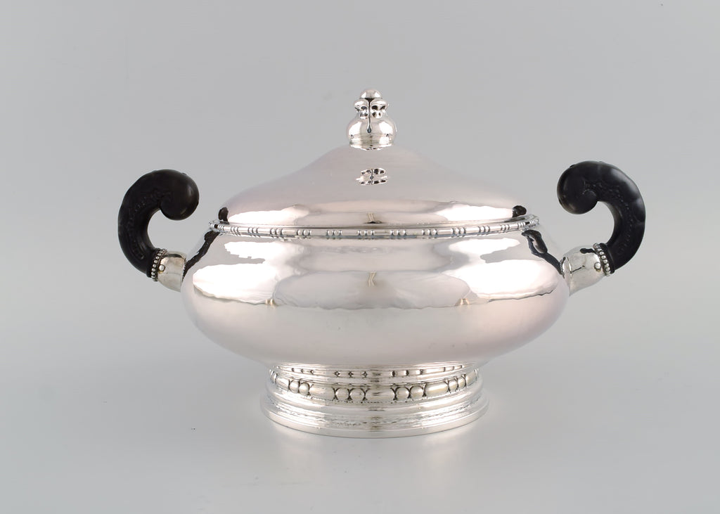 Evald Nielsen (1879-1958), Danish silversmith. Lidded art nouveau silver tureen with handles of horn. Dated 1918.