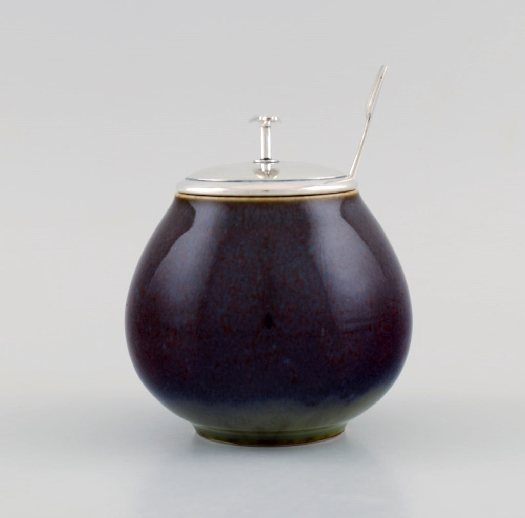Royal Copenhagen and Franz Hingelberg. Lidded jar in glazed stoneware with modernist lid and spoon in sterling silver. Mid-20th century.