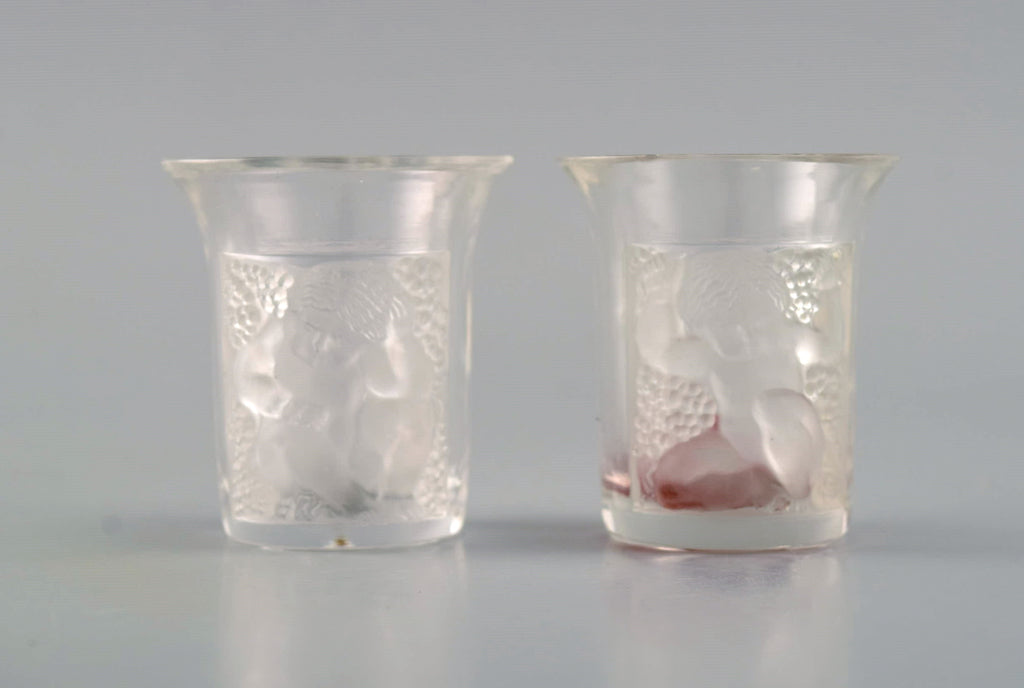 Two early René Lalique Enfants art deco shot glasses in mouth-blown crystal glass. 1930s.