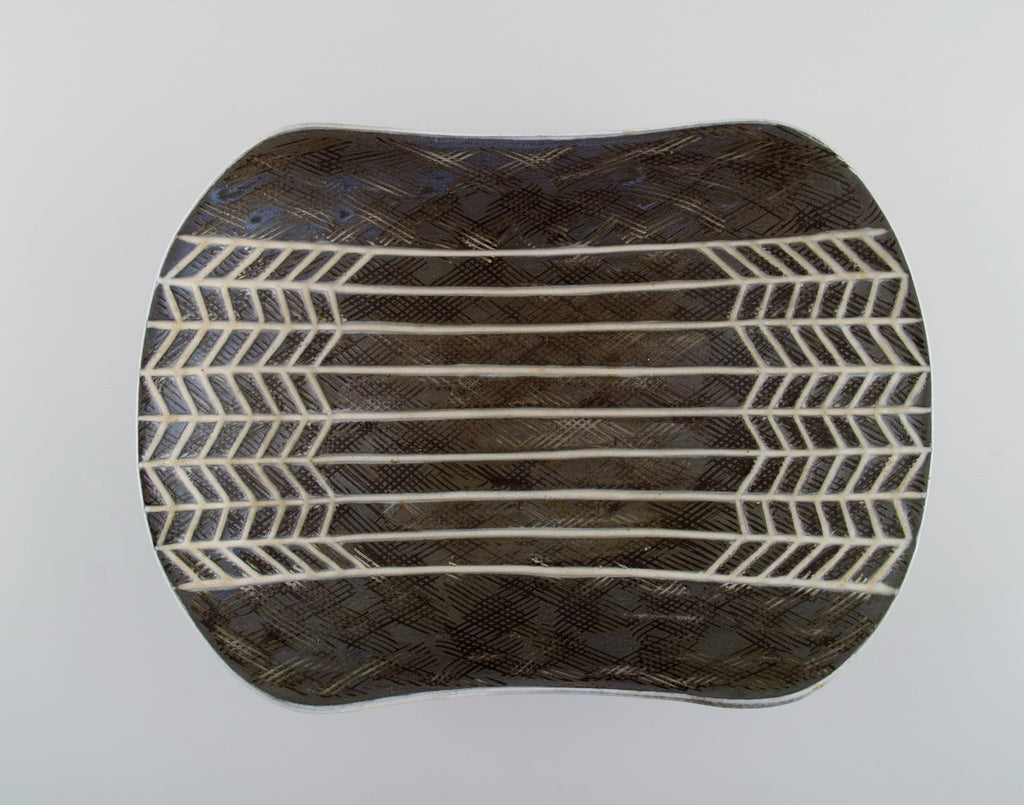 Mari Simmulson (1911-2000) for Upsala-Ekeby. Large bowl in glazed stoneware from her well-known Ax series. Incised grain decor on brown background. Mid-20th century.