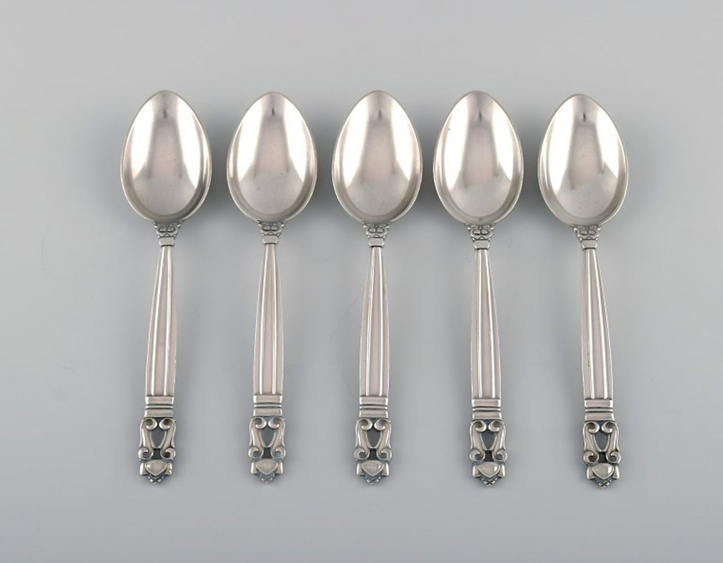 Five Georg Jensen Acorn children's spoons in sterling silver.