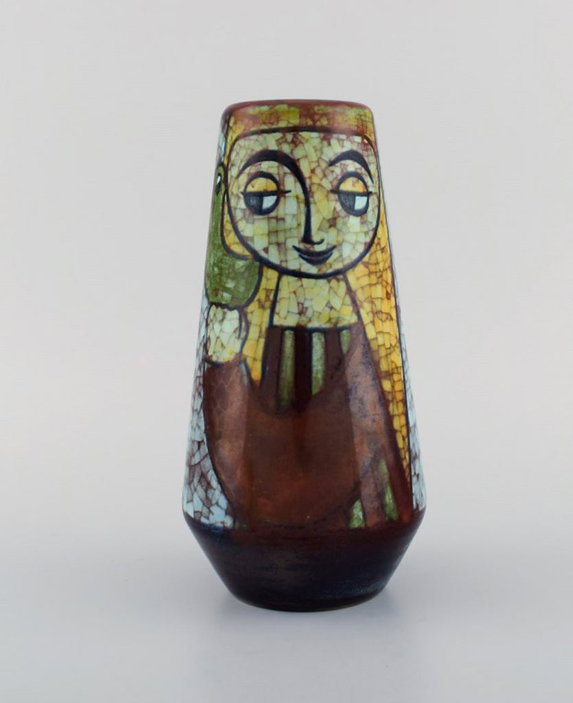 Michael Andersen, Denmark. Vase in glazed ceramics with young girls and birds. Beautiful crackled glaze. 1950s.