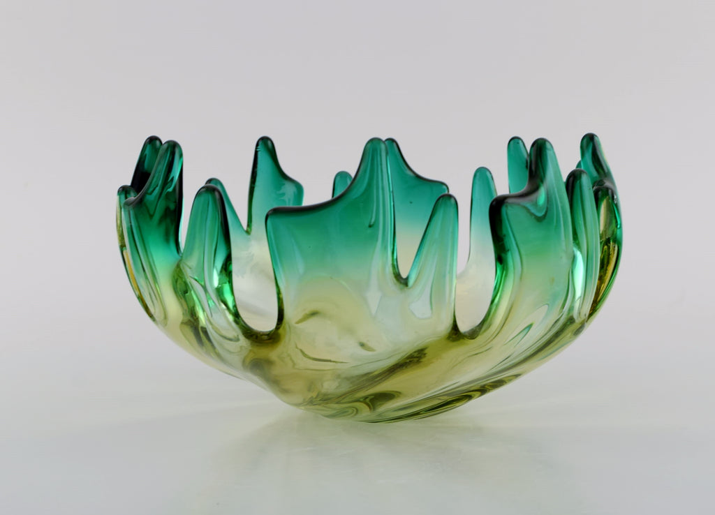 Murano bowl in mouth blown art glass. Green and yellow shades. 1960s.
