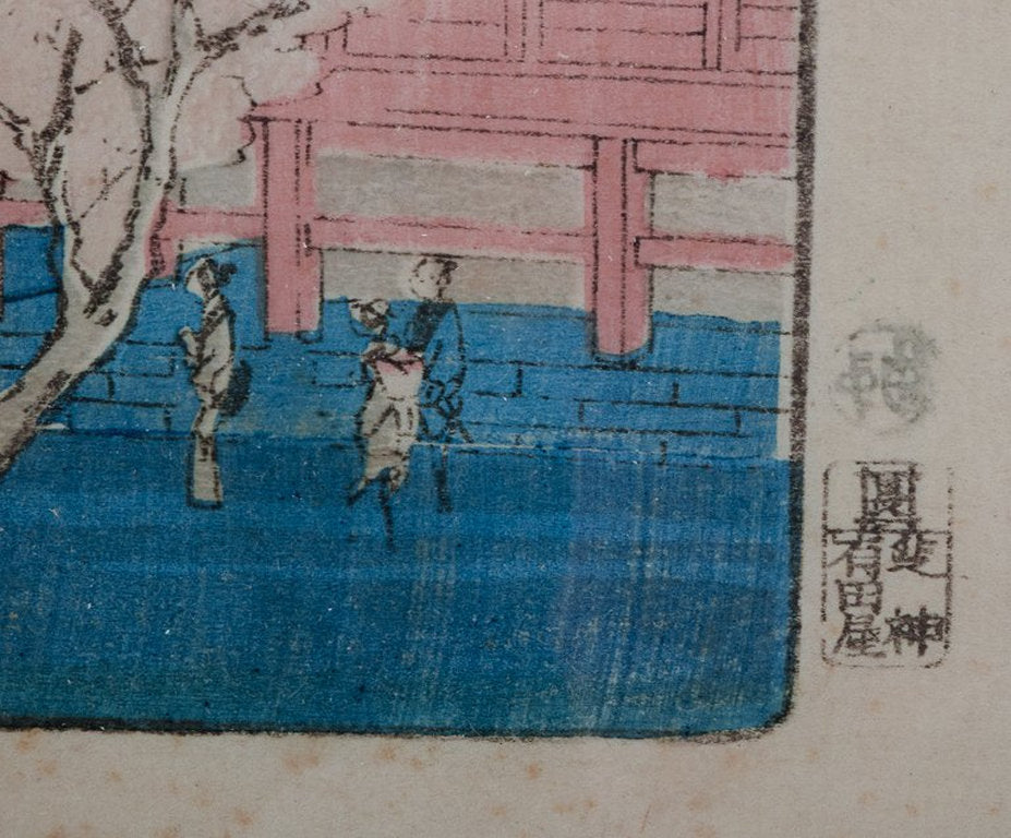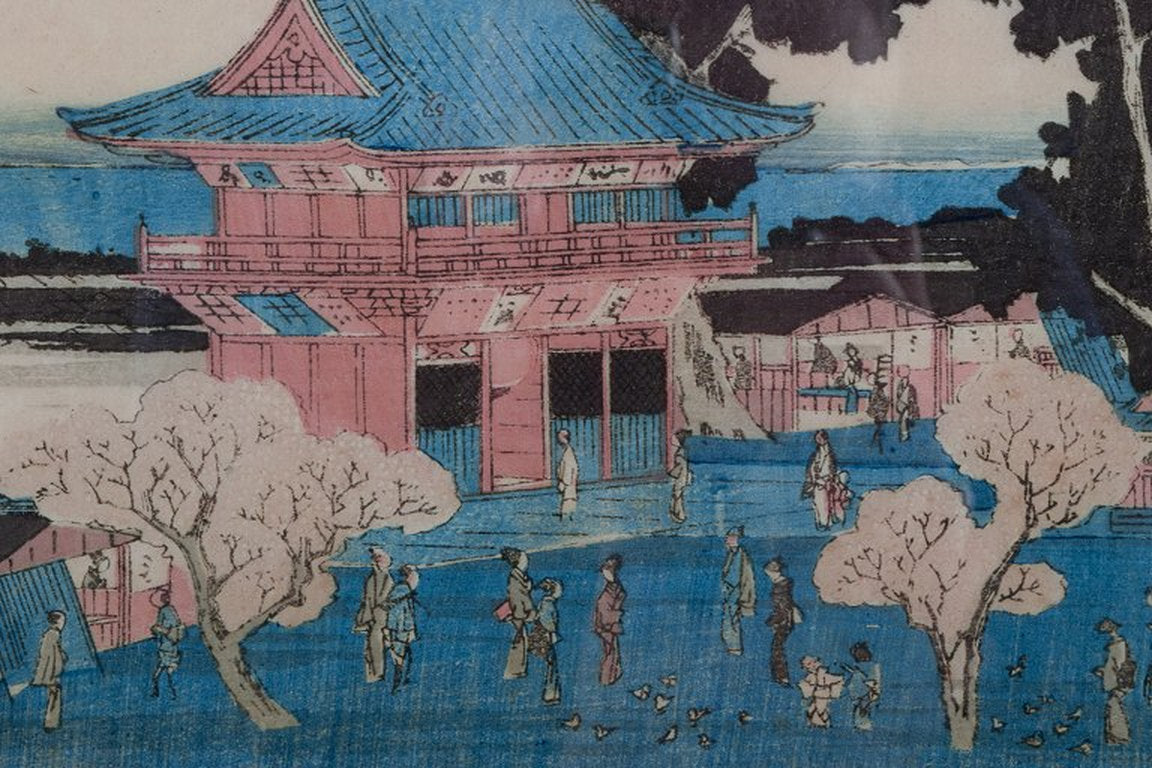 Utagawa Hiroshige (after), Shiba Atogayama. Japanese woodcut on Japanese paper. People at a temple. Early 20th century.