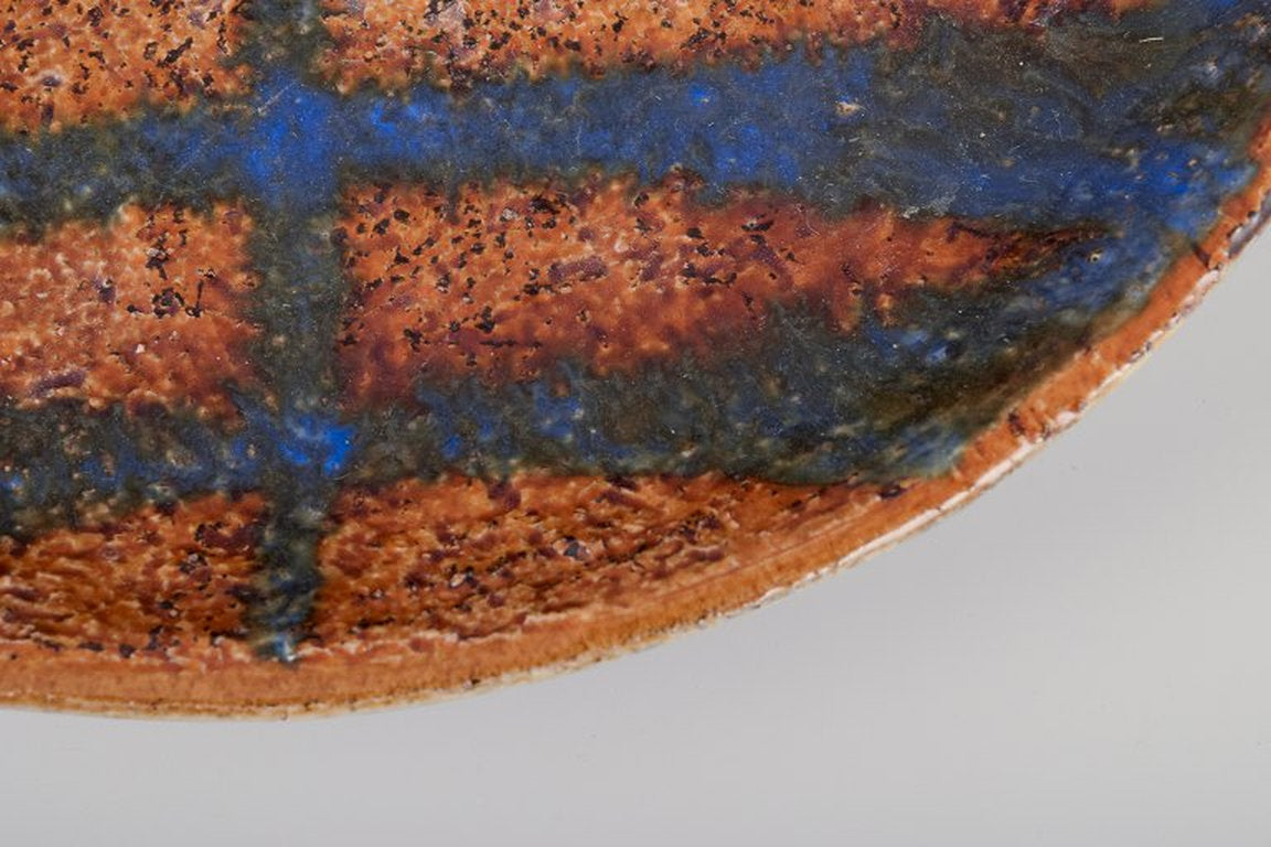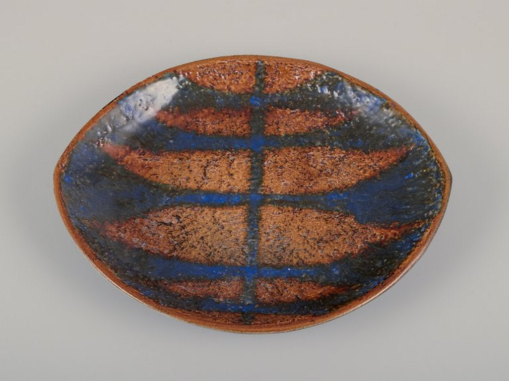 Mari Simmulson for Upsala Ekeby, Sweden. Low ceramic bowl with glaze in blue and ochre tones. Approximately 1960s.
