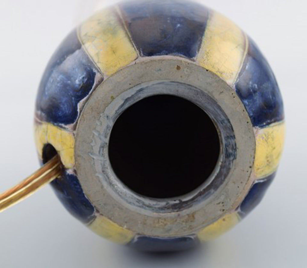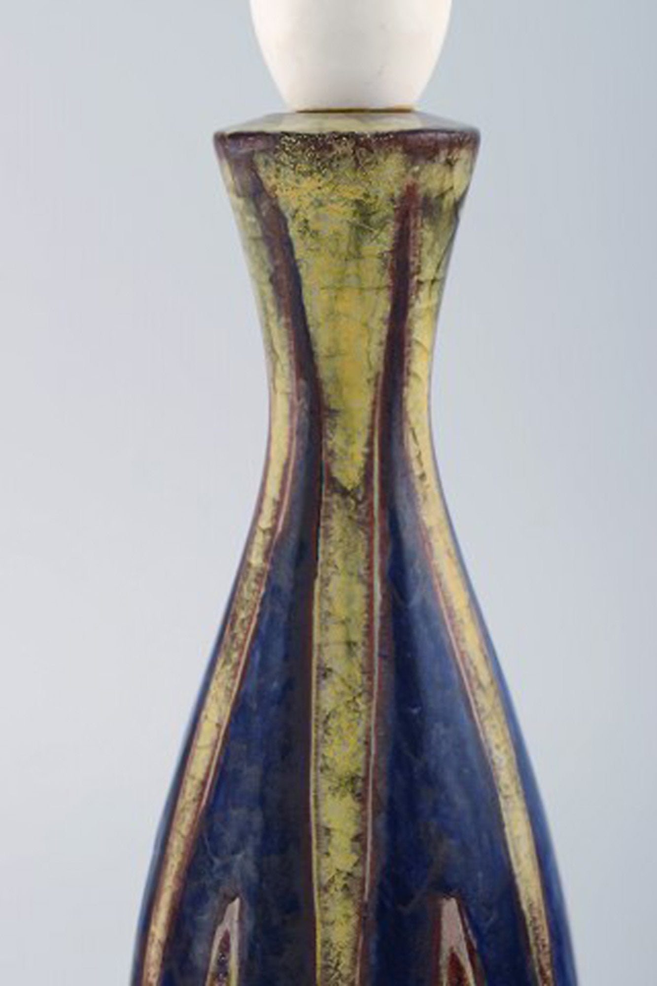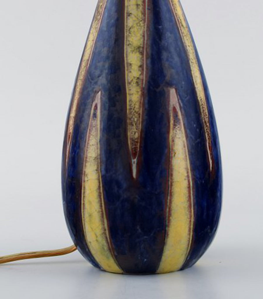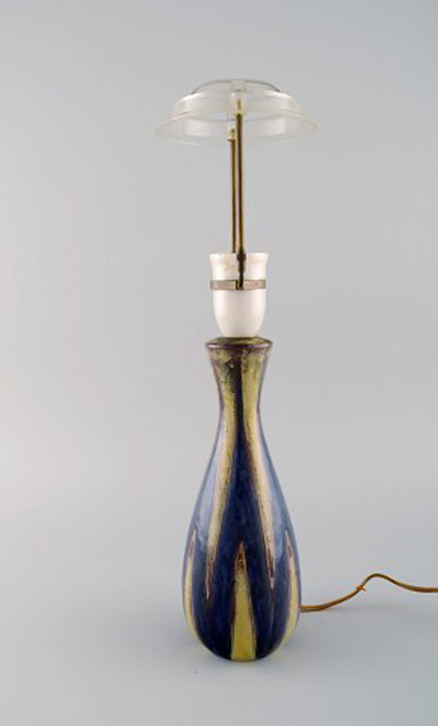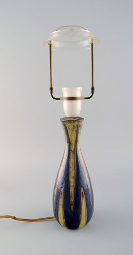Michael Andersen, Denmark. Table lamp in glazed ceramics. Beautiful glaze in shades of blue and yellow. 1950s.