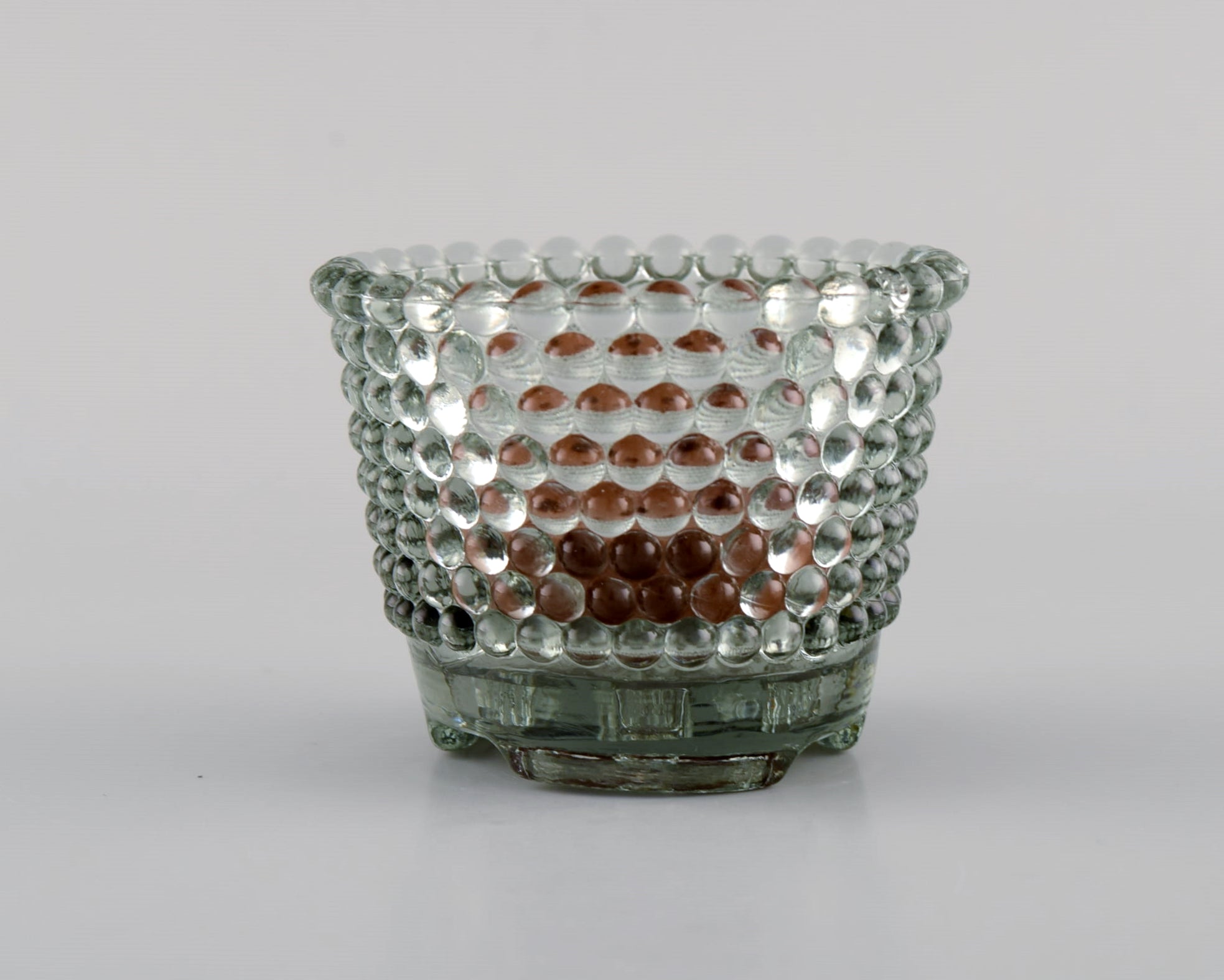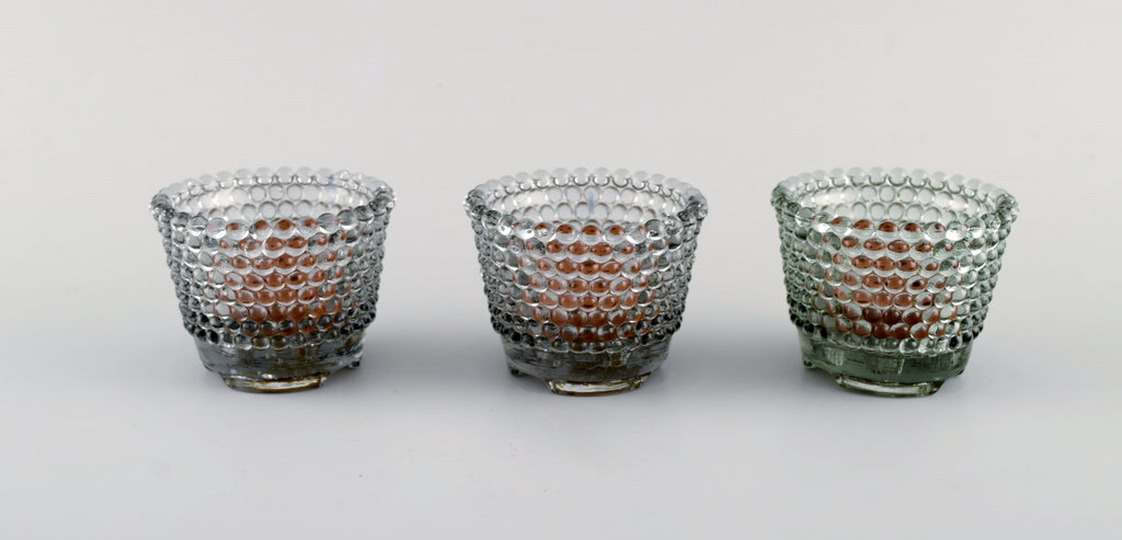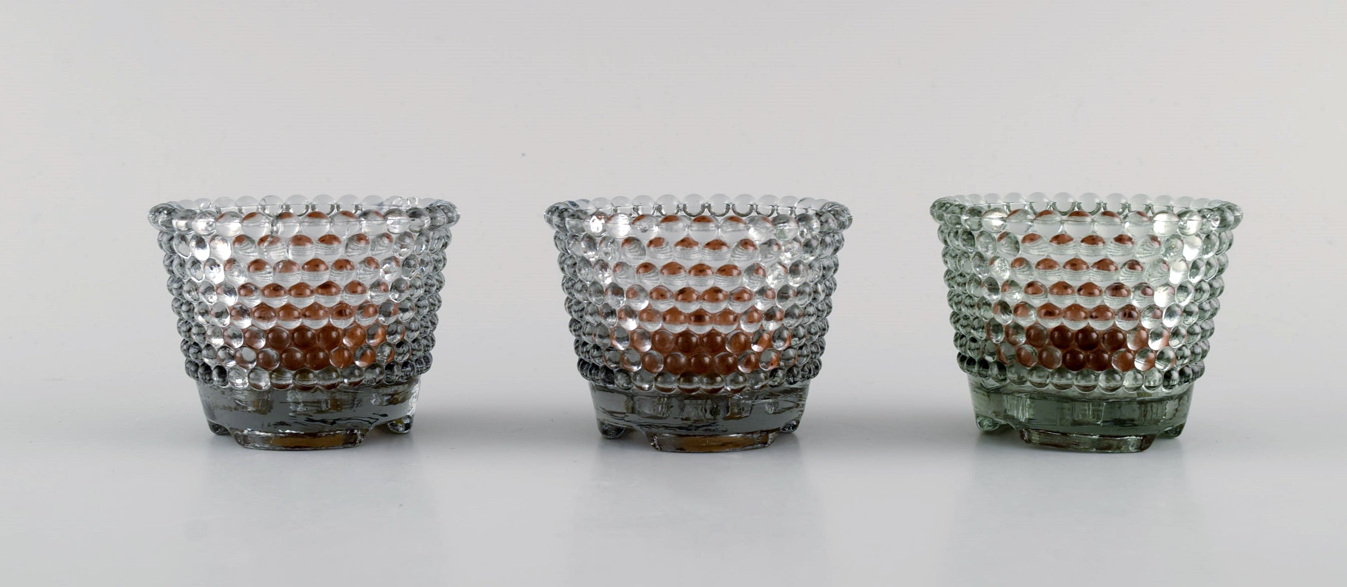 Monica Bratt for Reijmyre. Three Pärlan candlesticks for small candles in mouth blown art glass. 1950s.