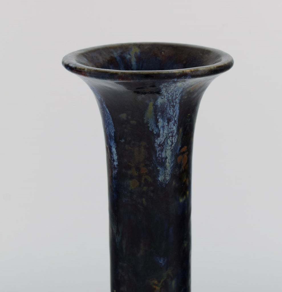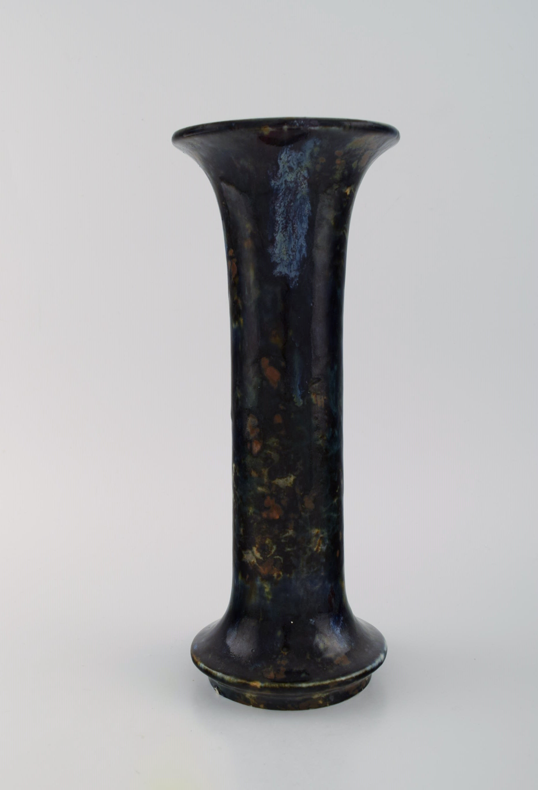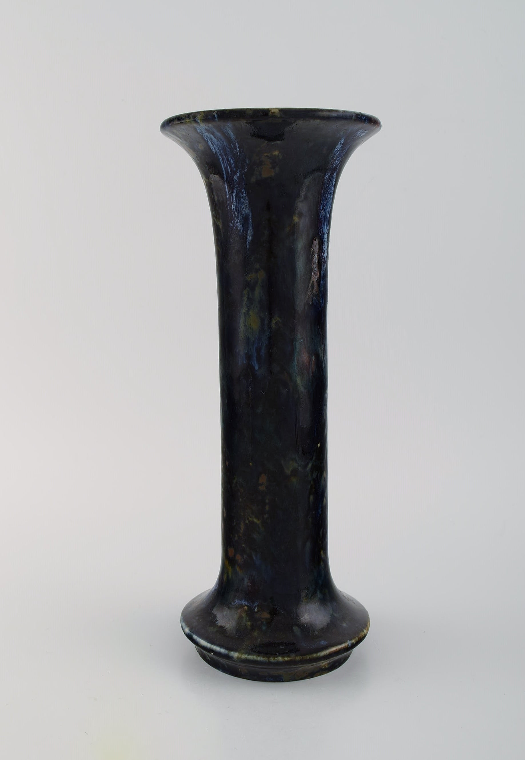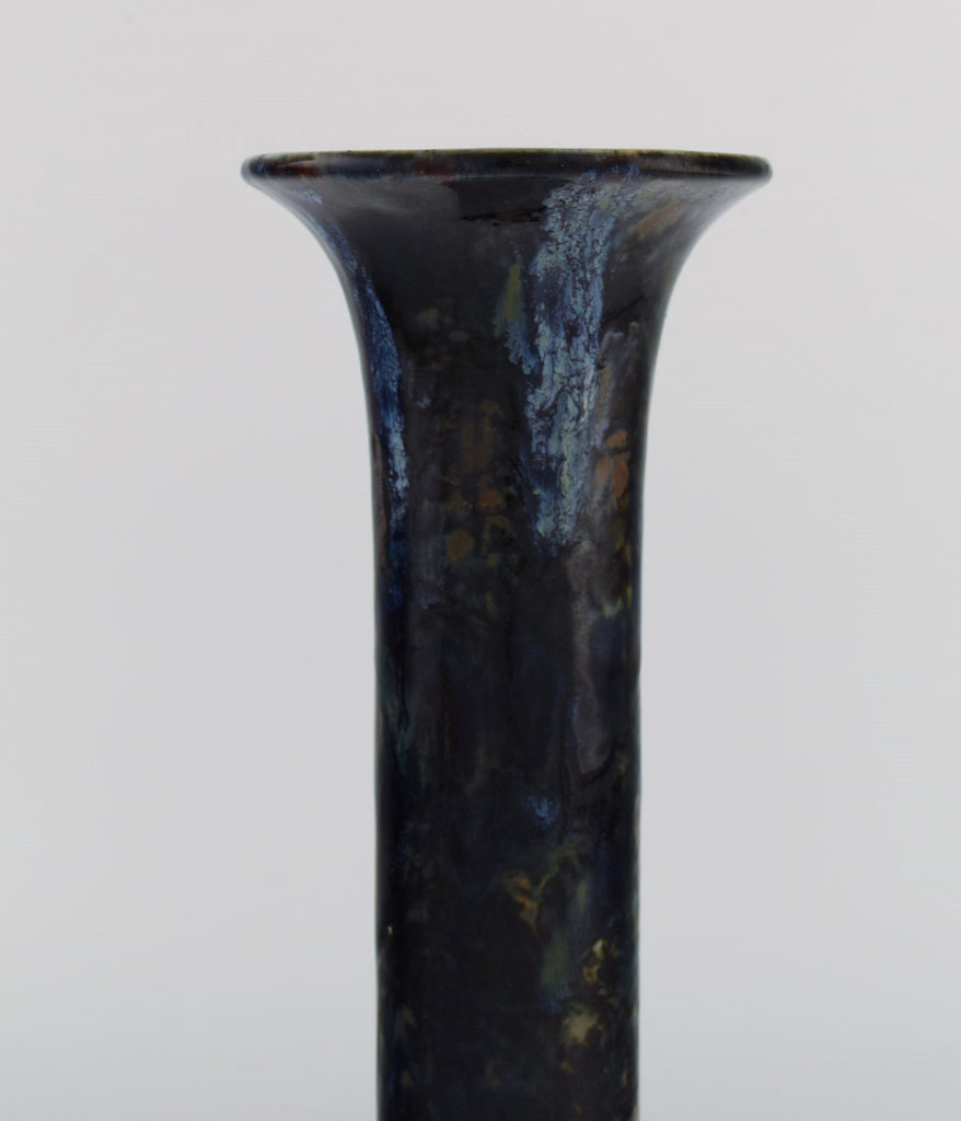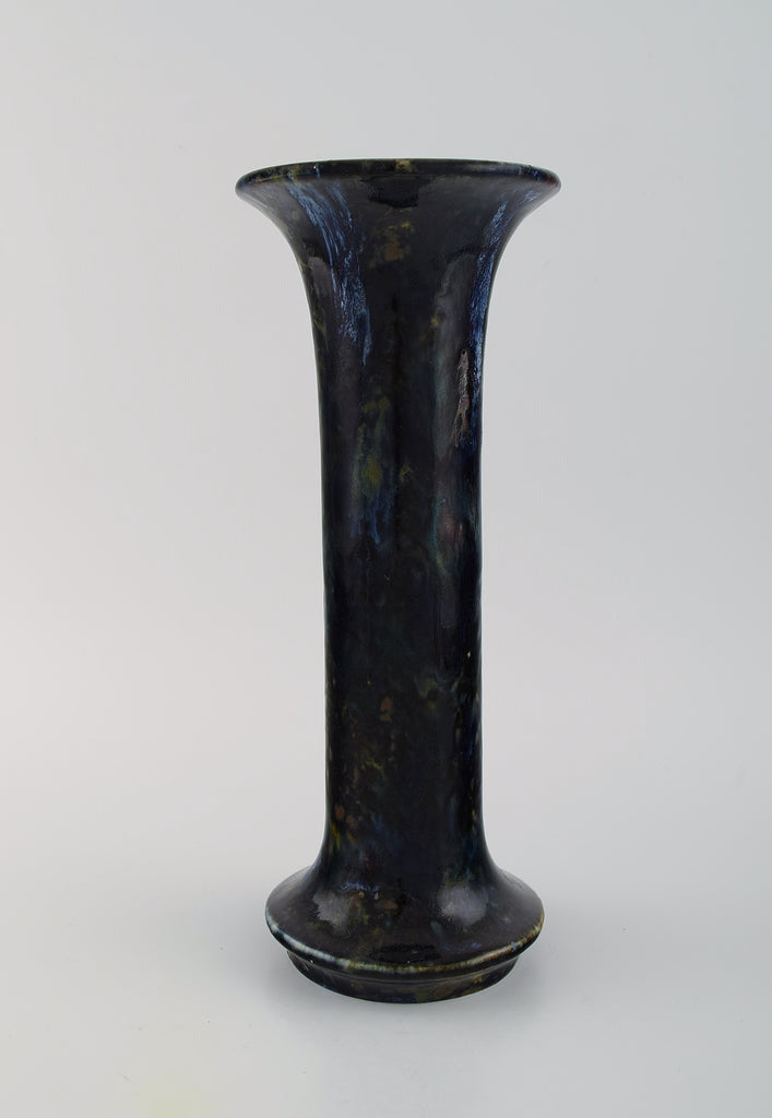 Jean Langlade (1879-1928), French potter. Vase in glazed ceramics. Beautiful glaze in black, ice blue and earth shades. 1920s.