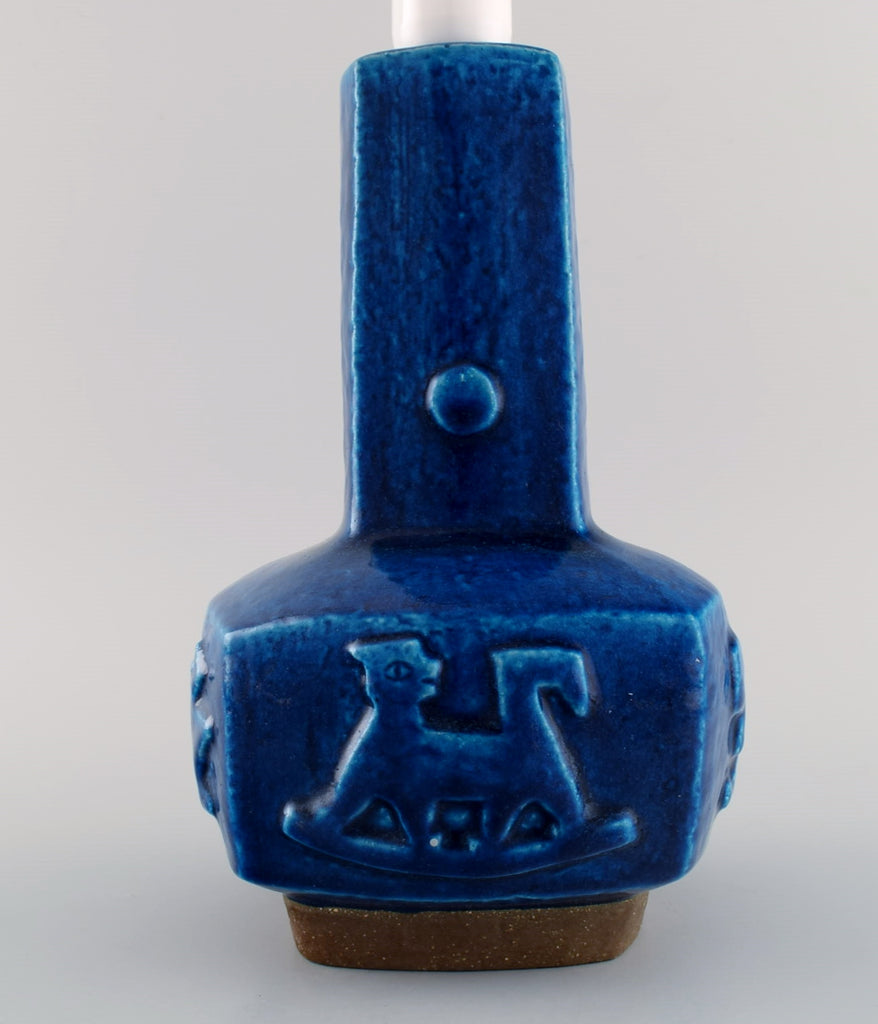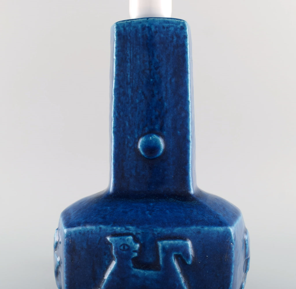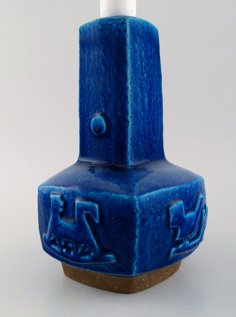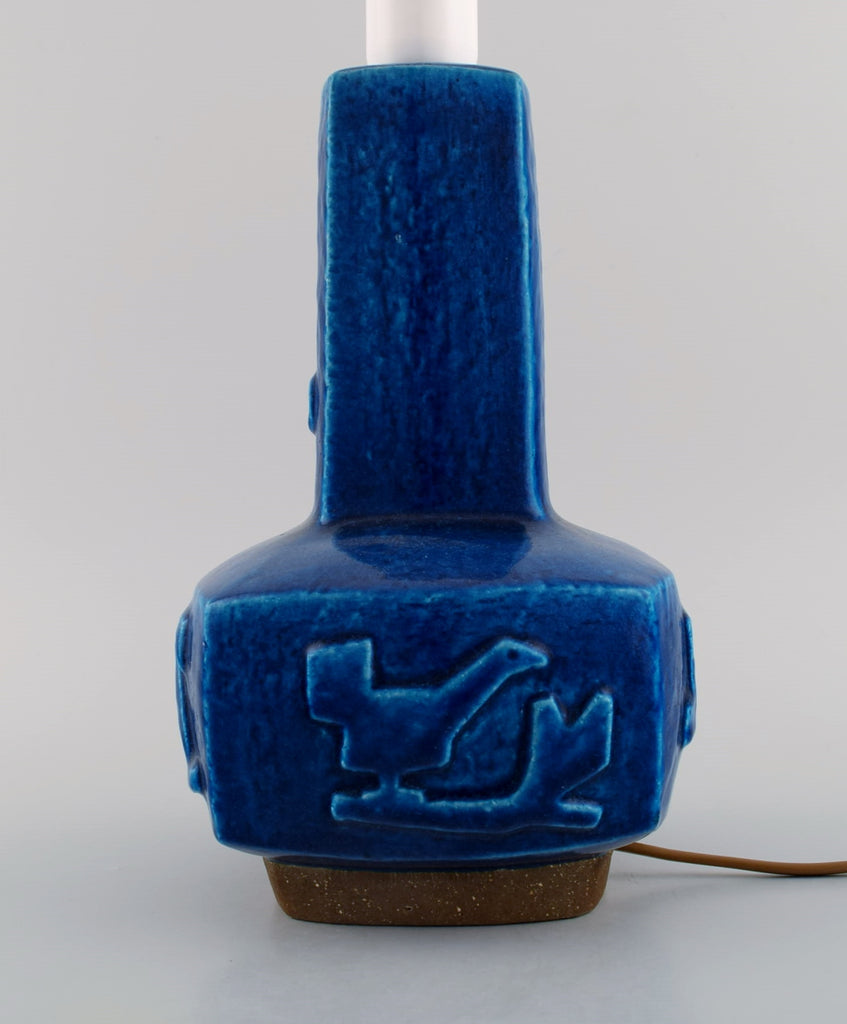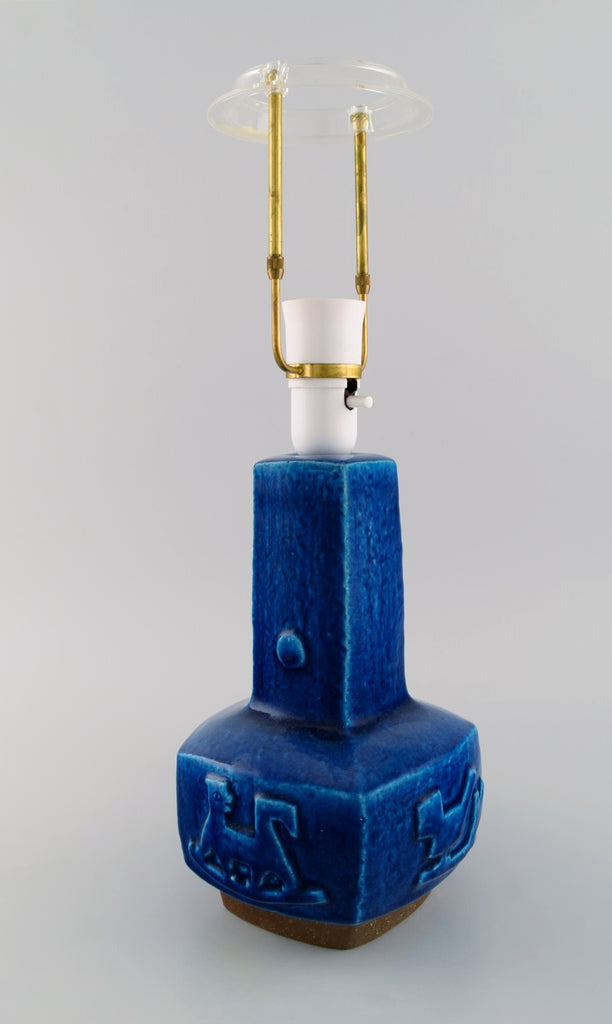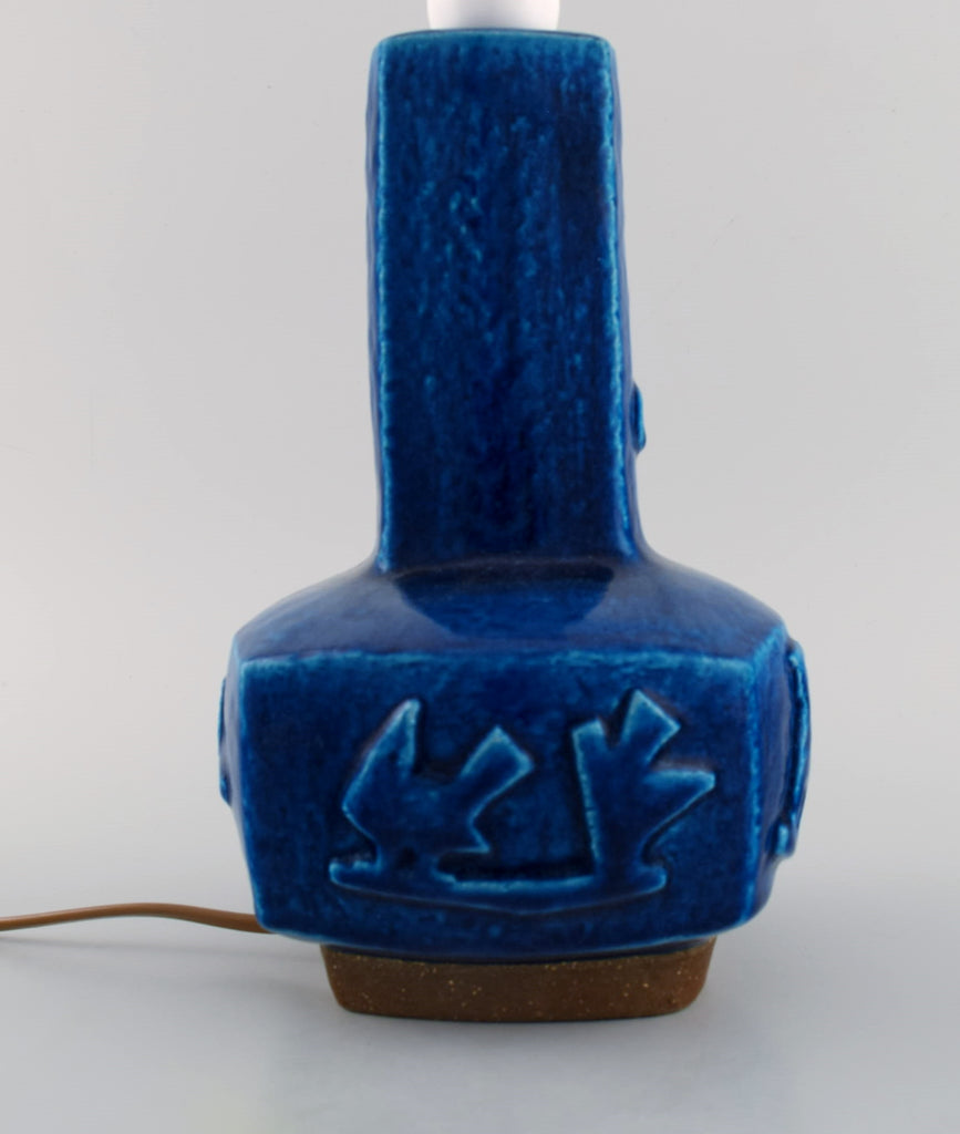 Jørgen Mogensen for Royal Copenhagen. Table lamp in blue-glazed stoneware with animals in relief. Mid-20th century.