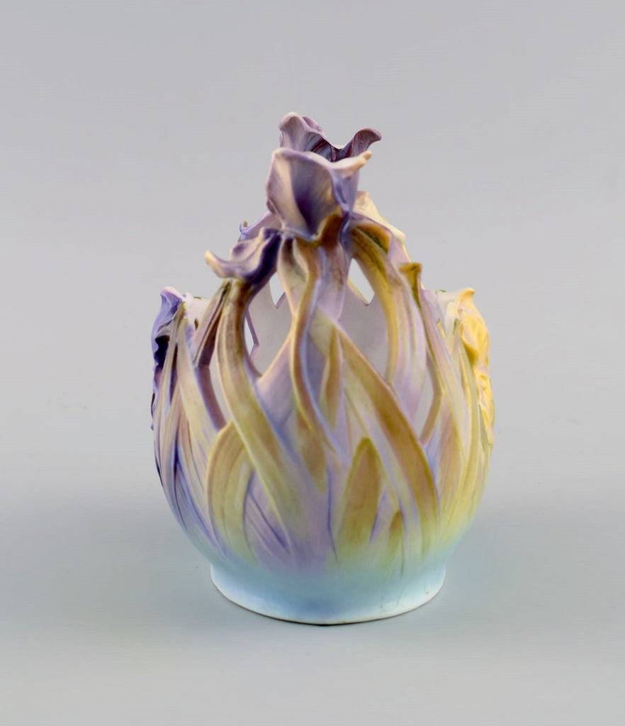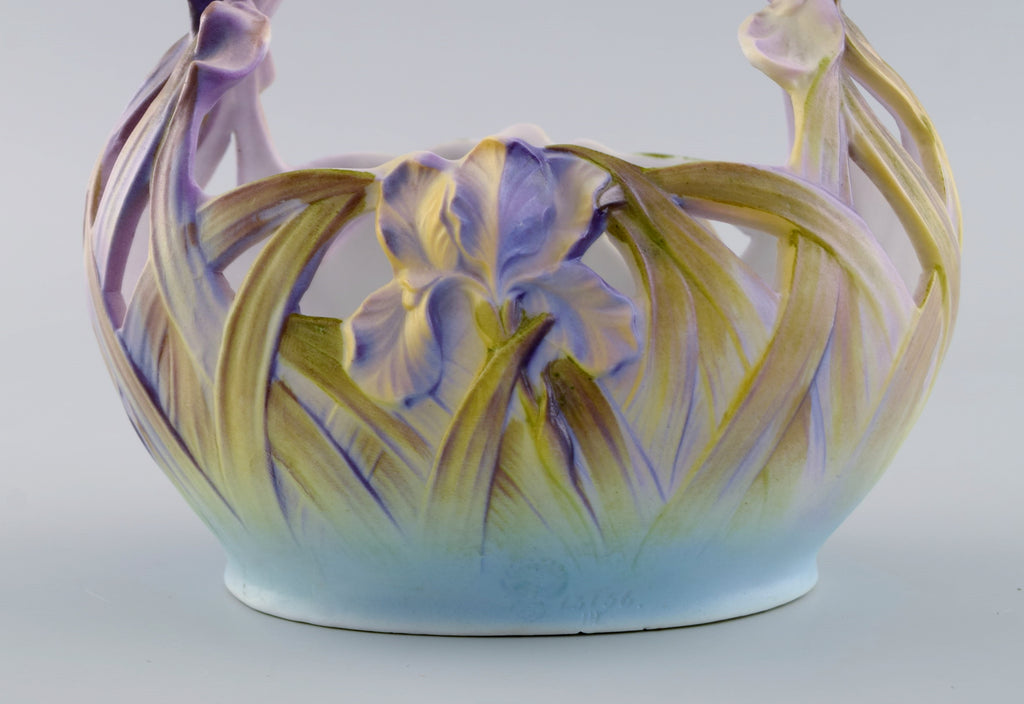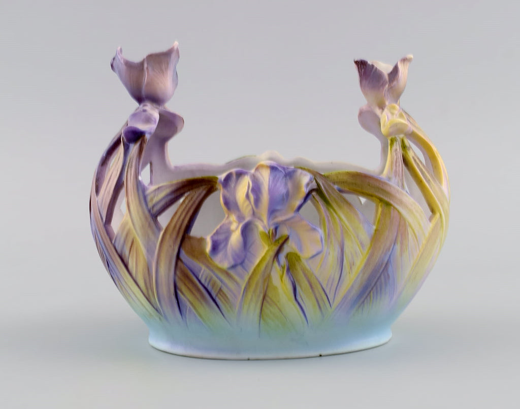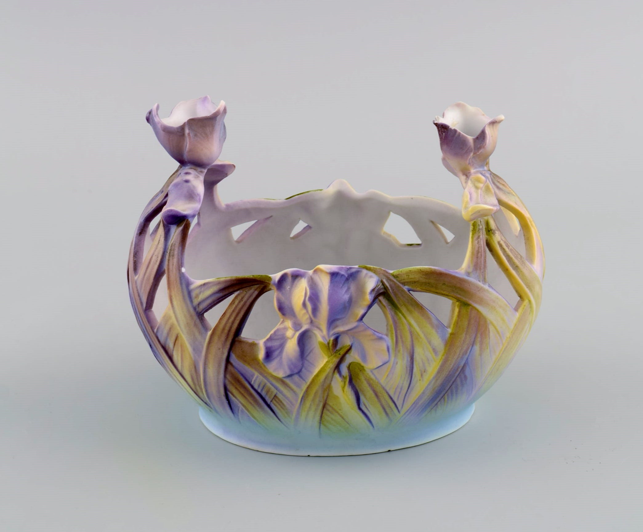 Heubach, Germany. Antique art nouveau bowl in openwork porcelain with hand-painted flowers. About 1900.