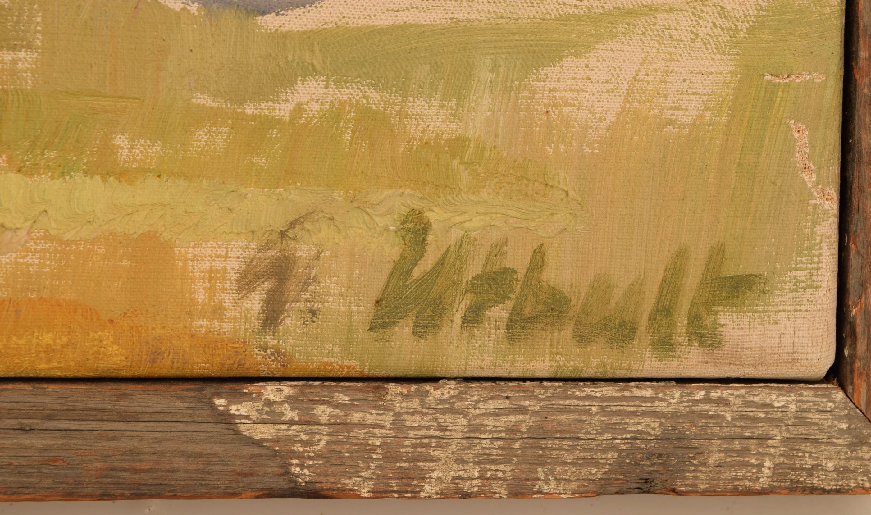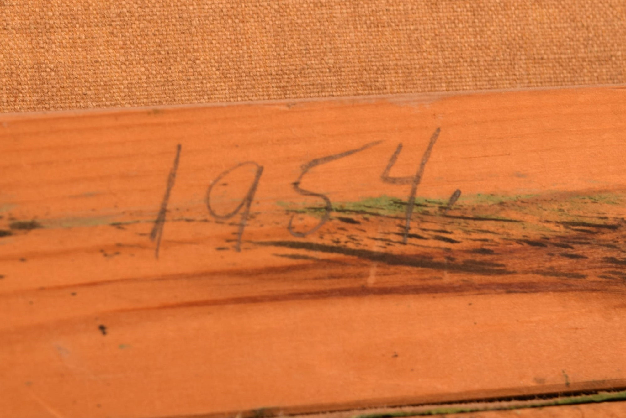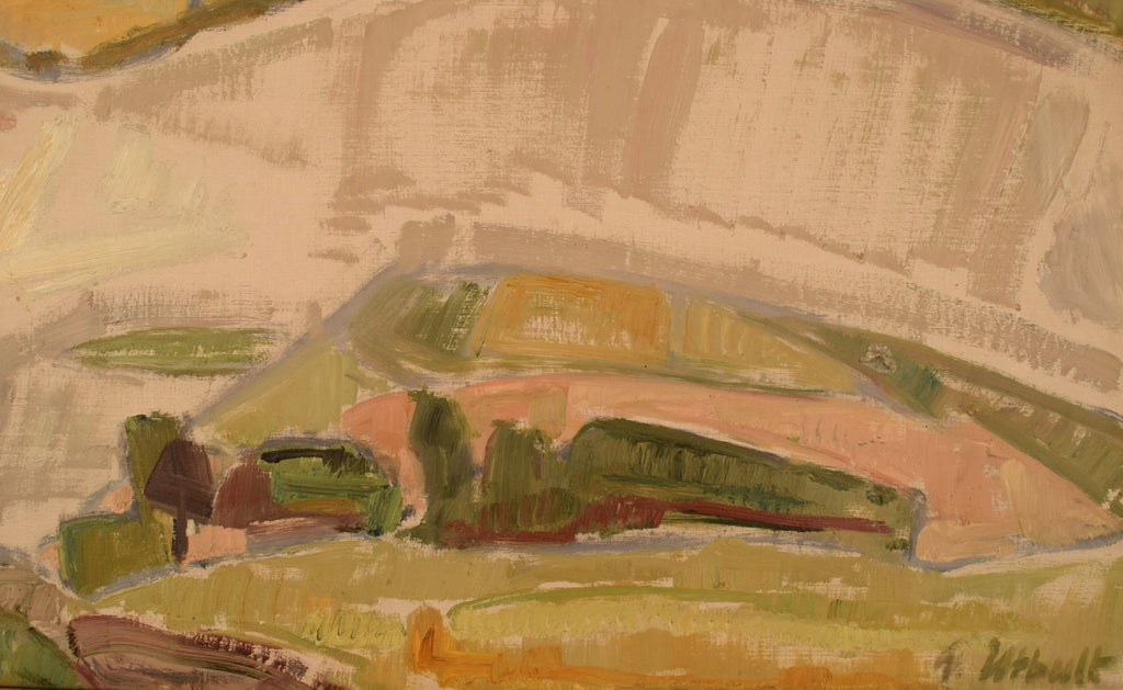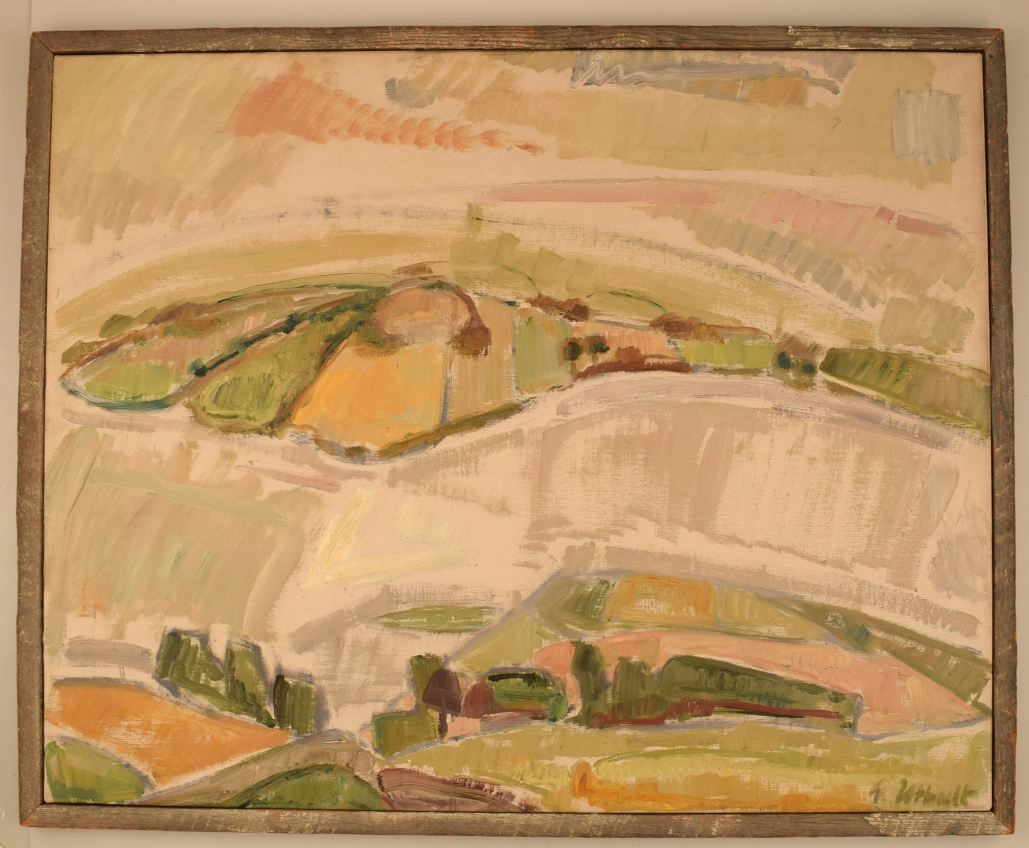 Greta Utbult (1914-2000), listed Swedish artist. Oil on canvas. Modernist landscape. Dated 1954.