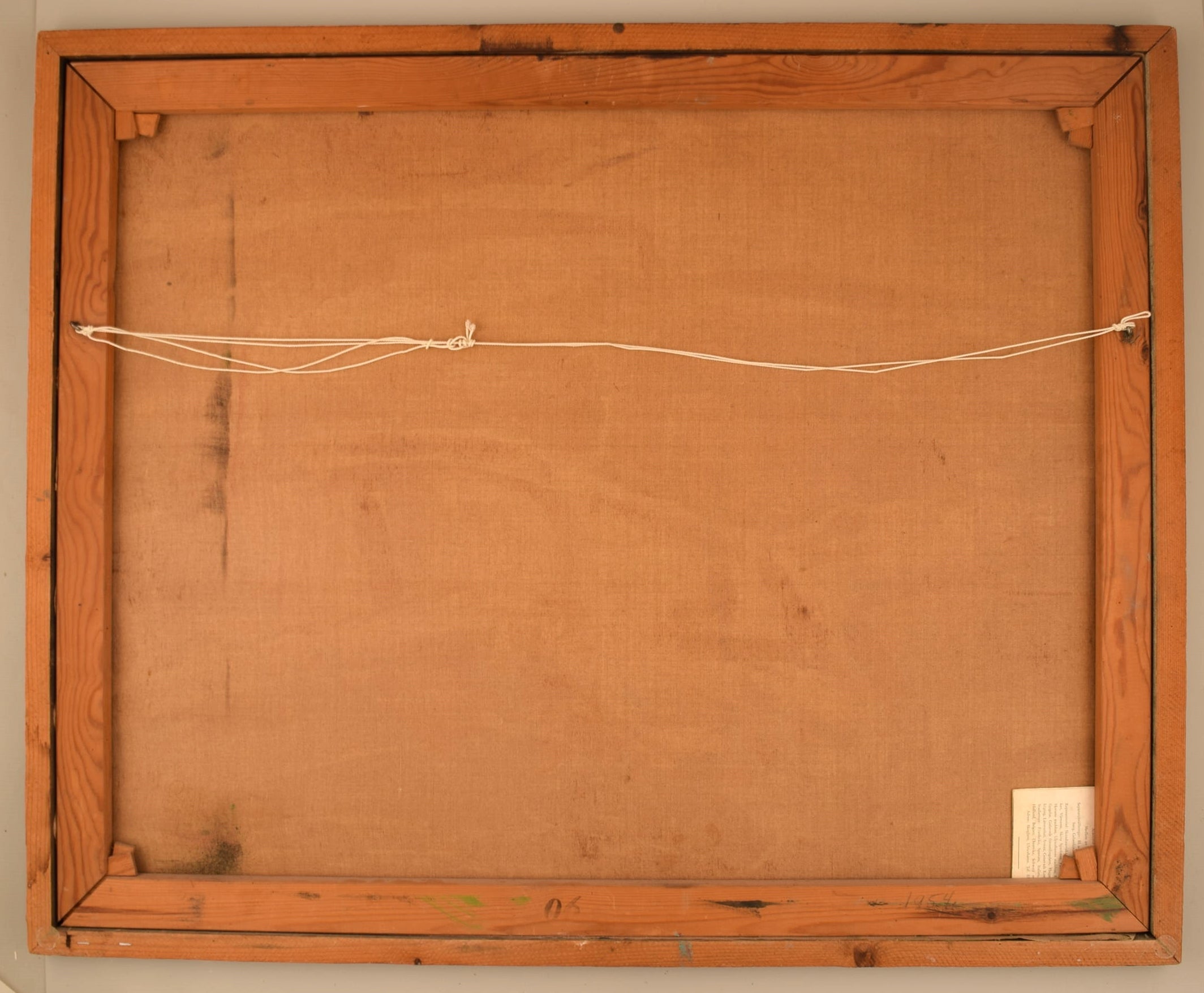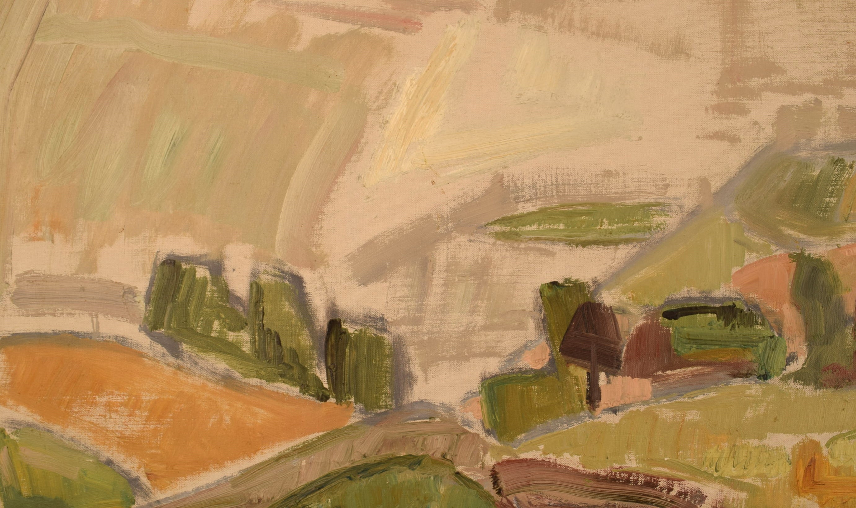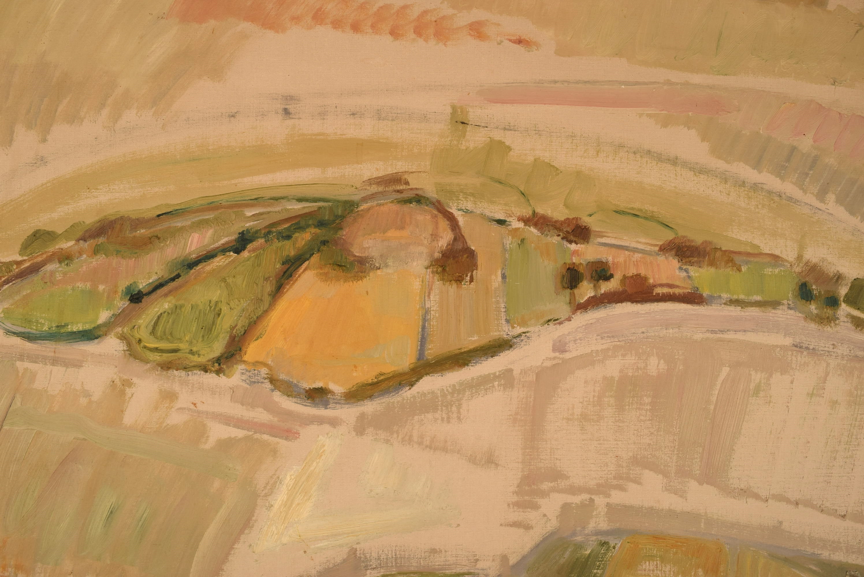 Greta Utbult (1914-2000), listed Swedish artist. Oil on canvas. Modernist landscape. Dated 1954.