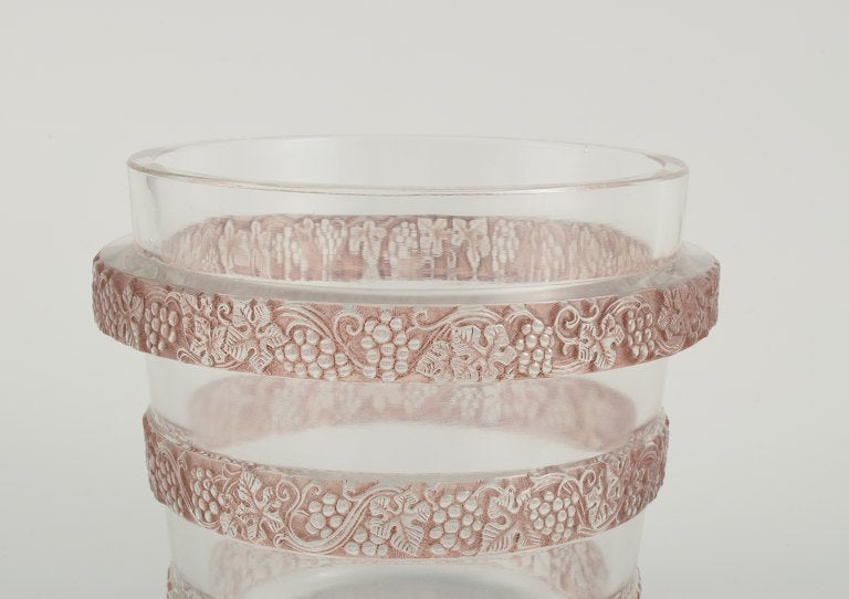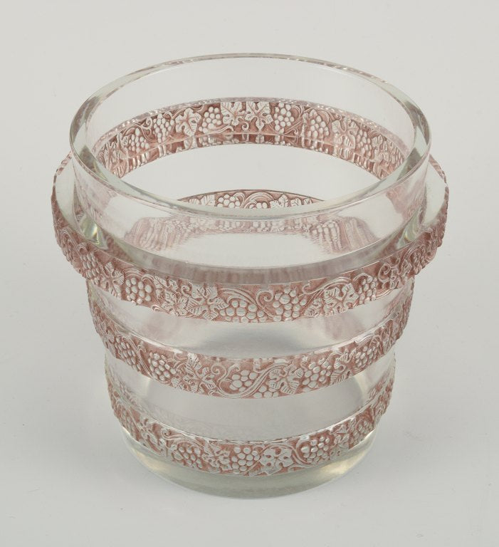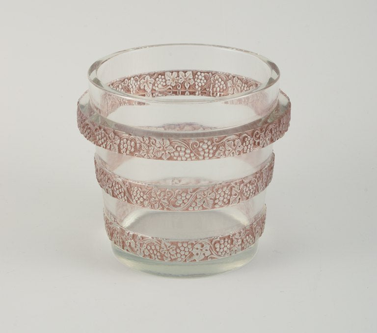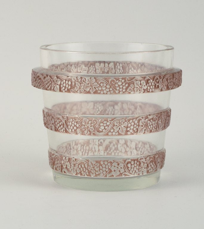 René Lalique Ricquewihr ice cooler. Rare and early René Lalique ice cooler in burgundy molded with three bands comprised of grapes and leaves in high relief.