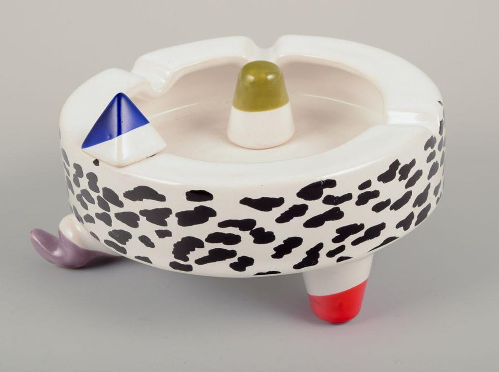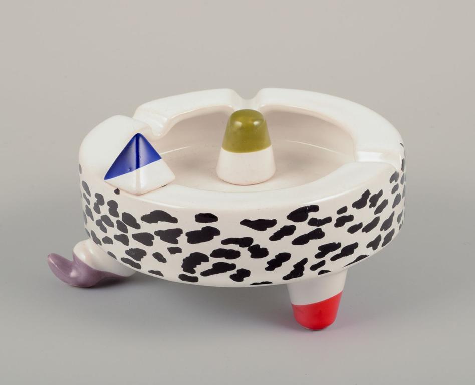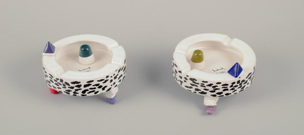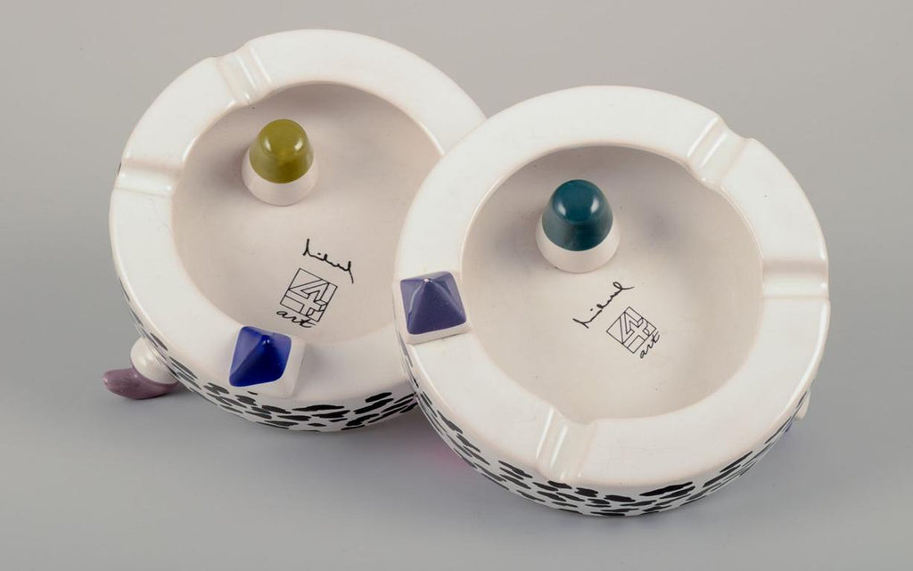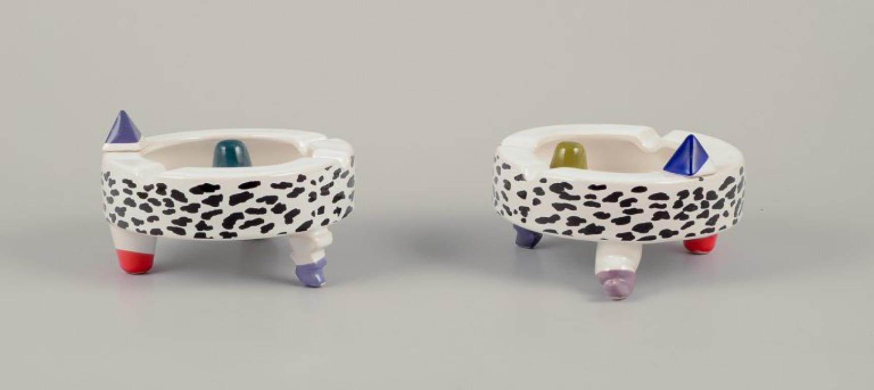 French studio ceramicist. Two ashtrays in faience. Abstract futuristic style. Late 20th C.