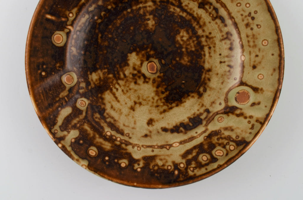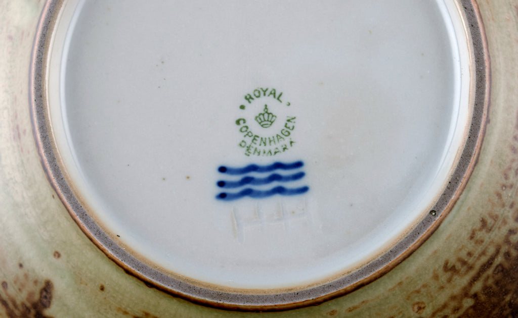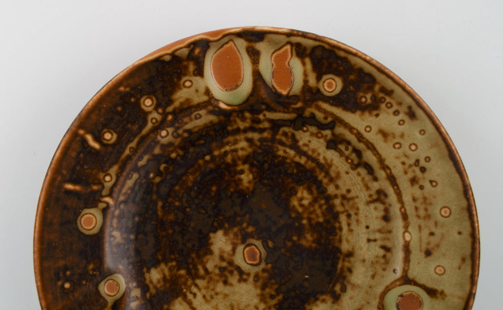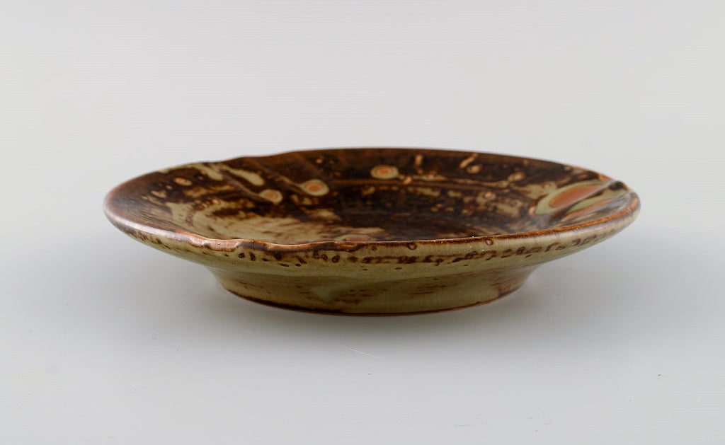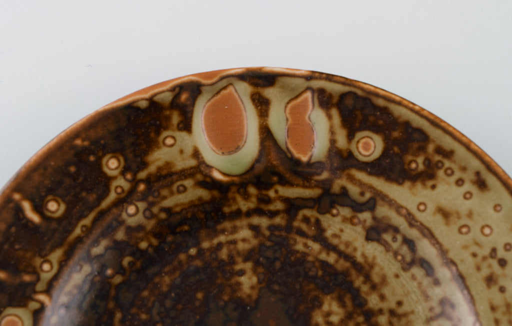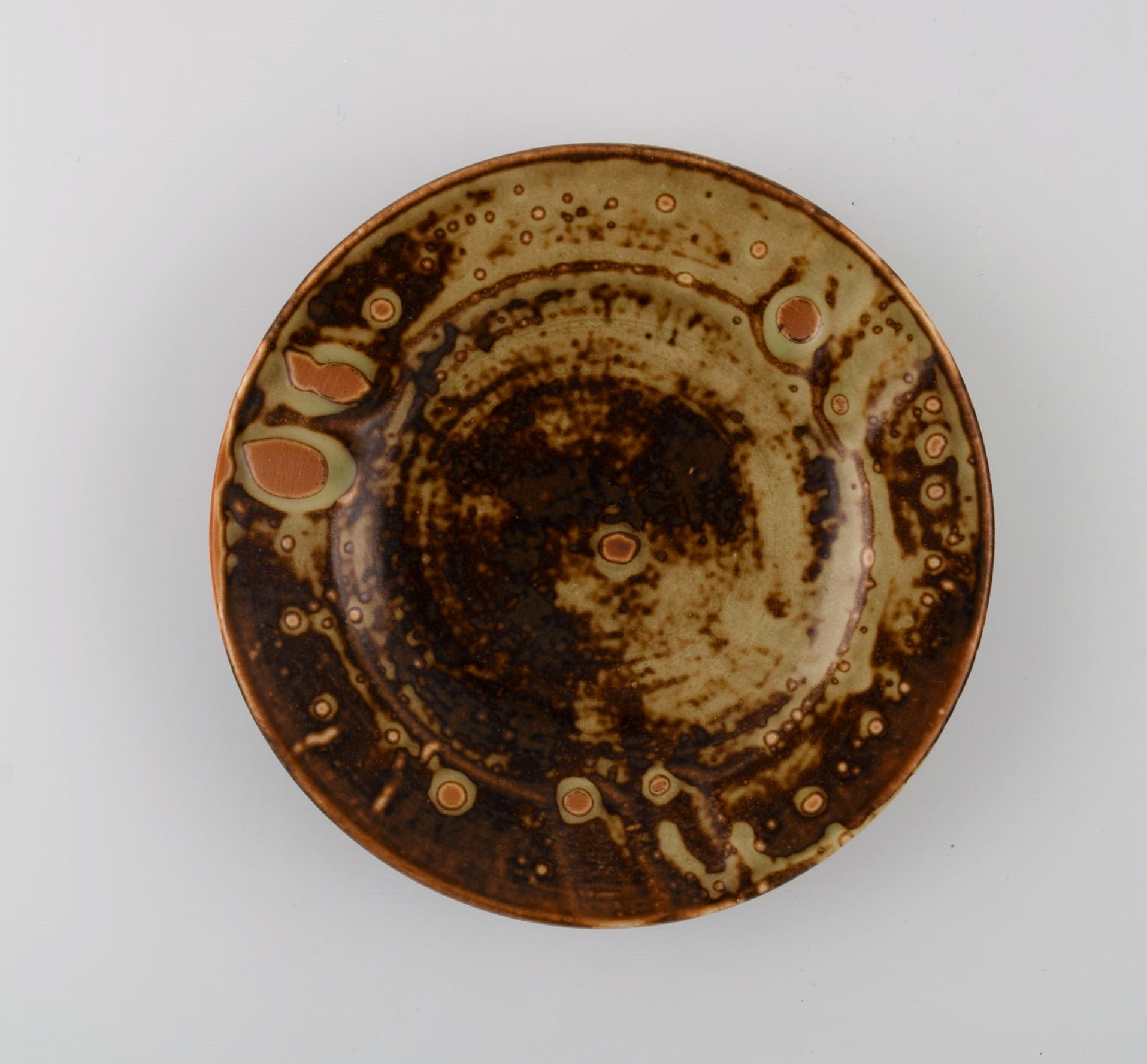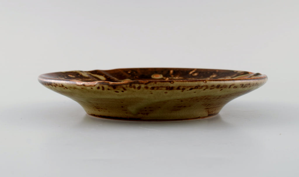 Hans Henrik Hansen for Royal Copenhagen. Round dish in glazed ceramics. Beautiful sung glaze. Dated 1956.