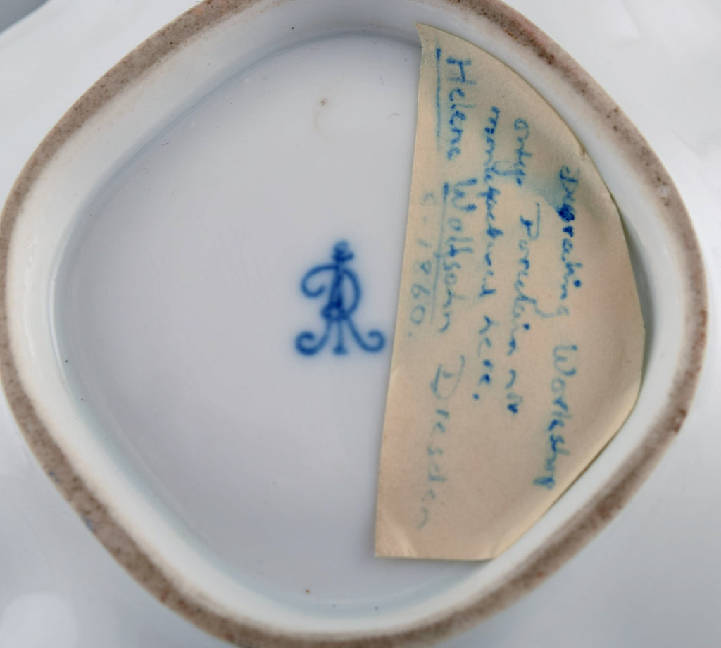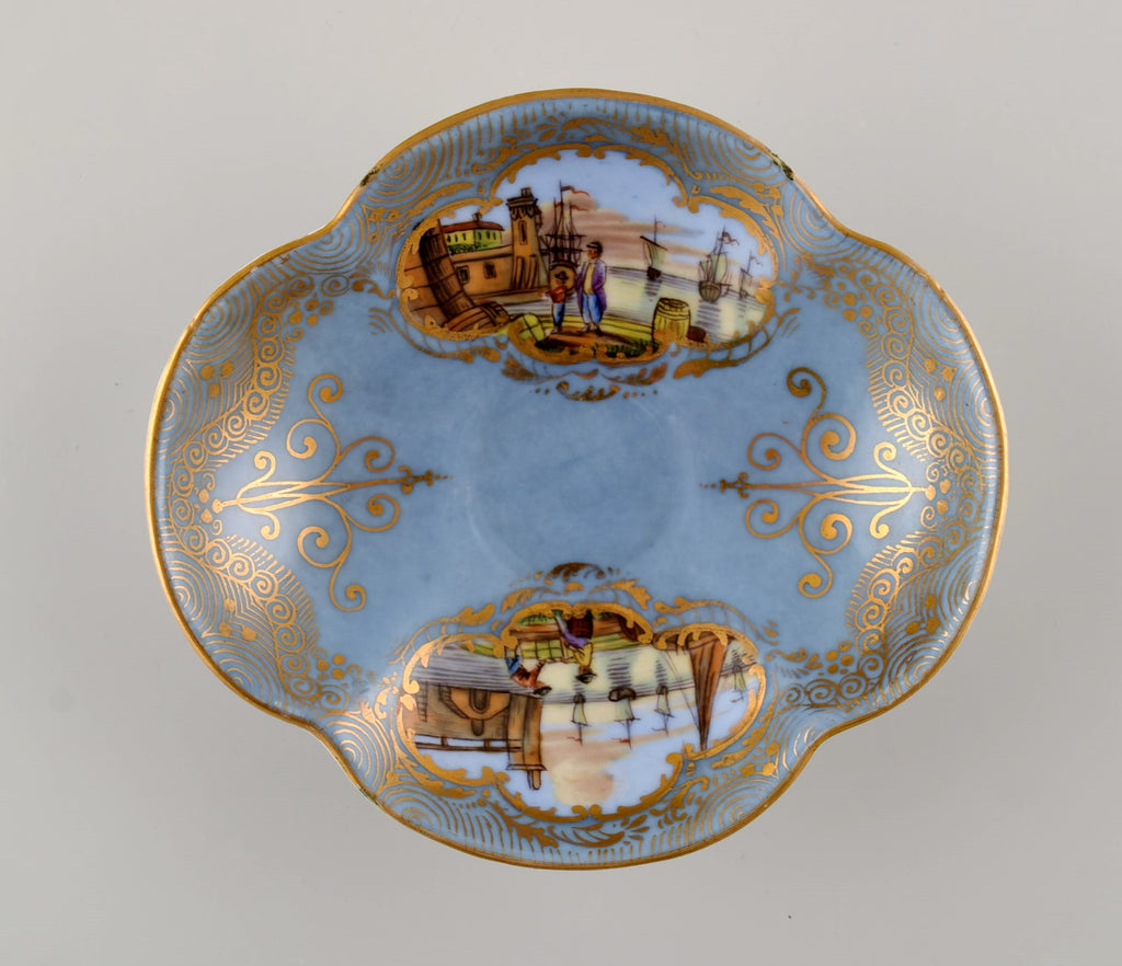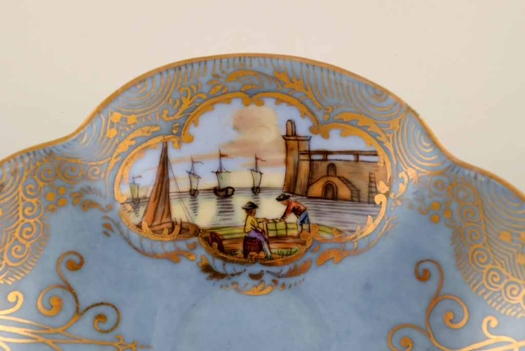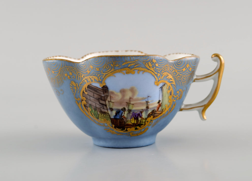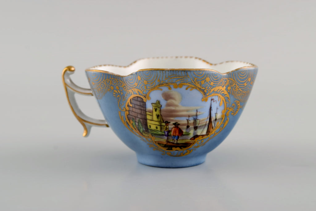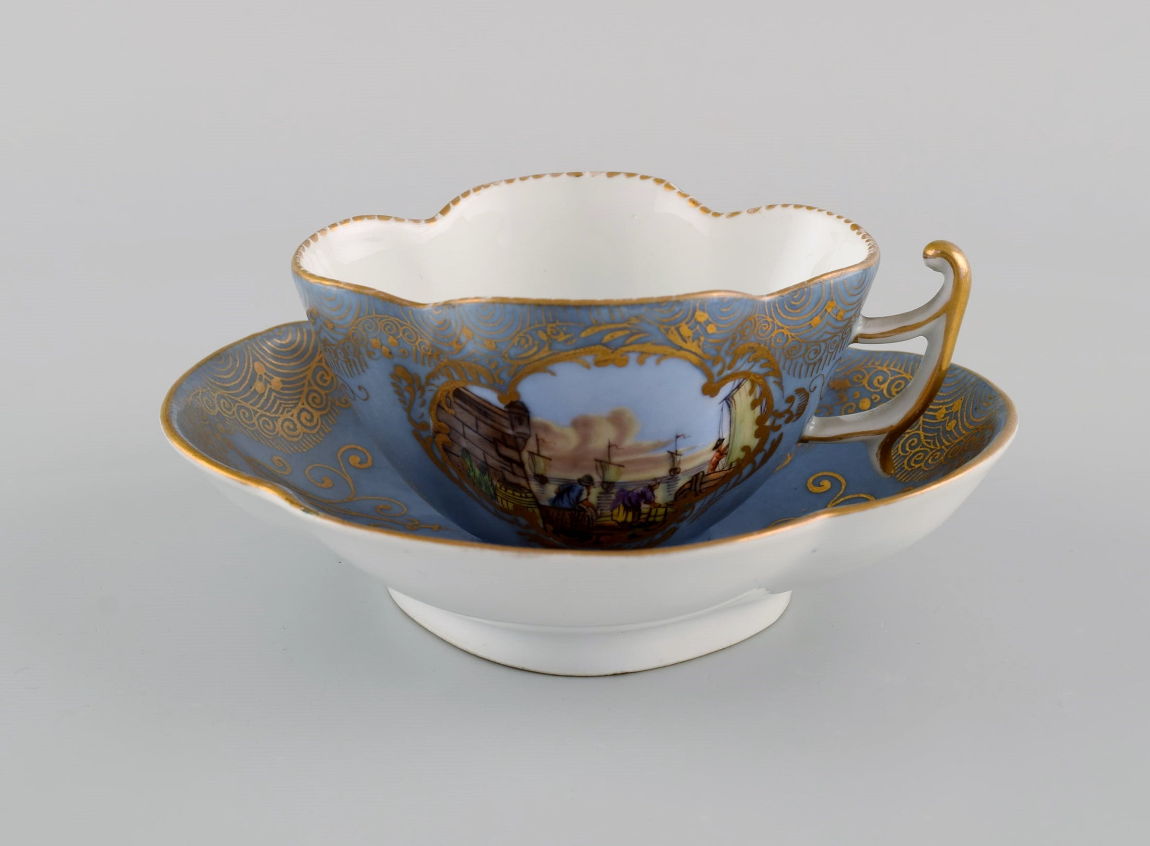 Helene Wolfson for Dresden. Antique coffee cup with saucer in hand-painted porcelain with merchants and gold decoration. Approx. 1860.