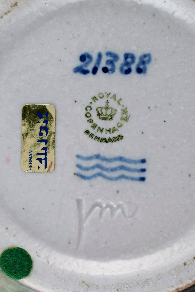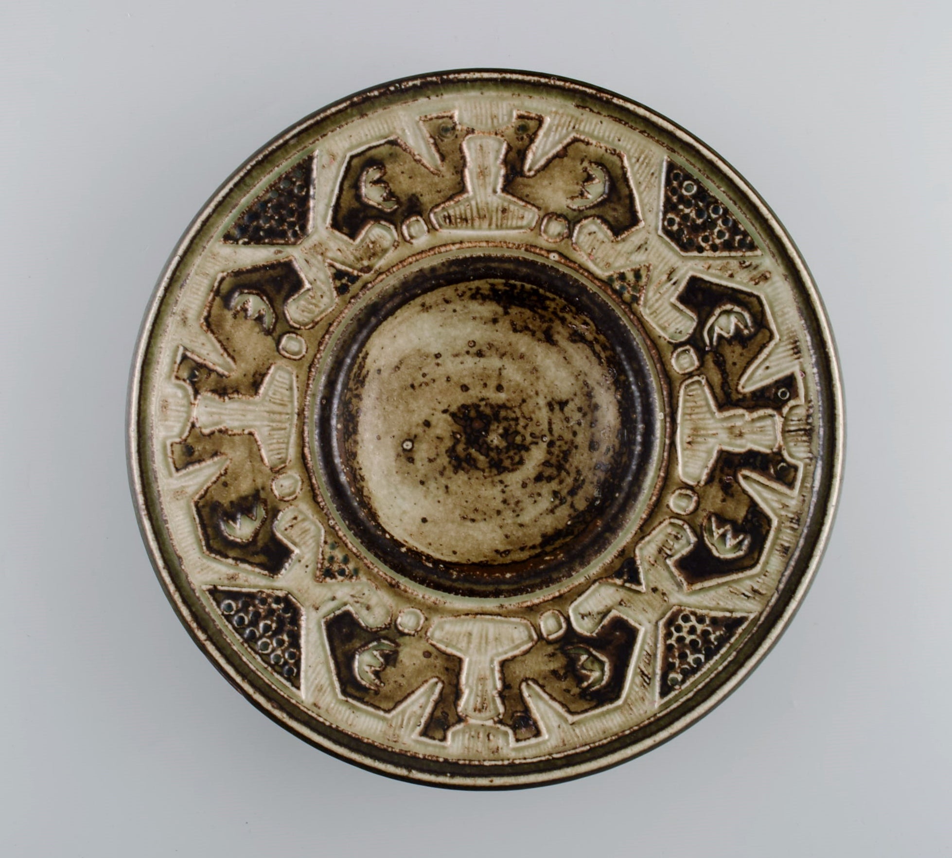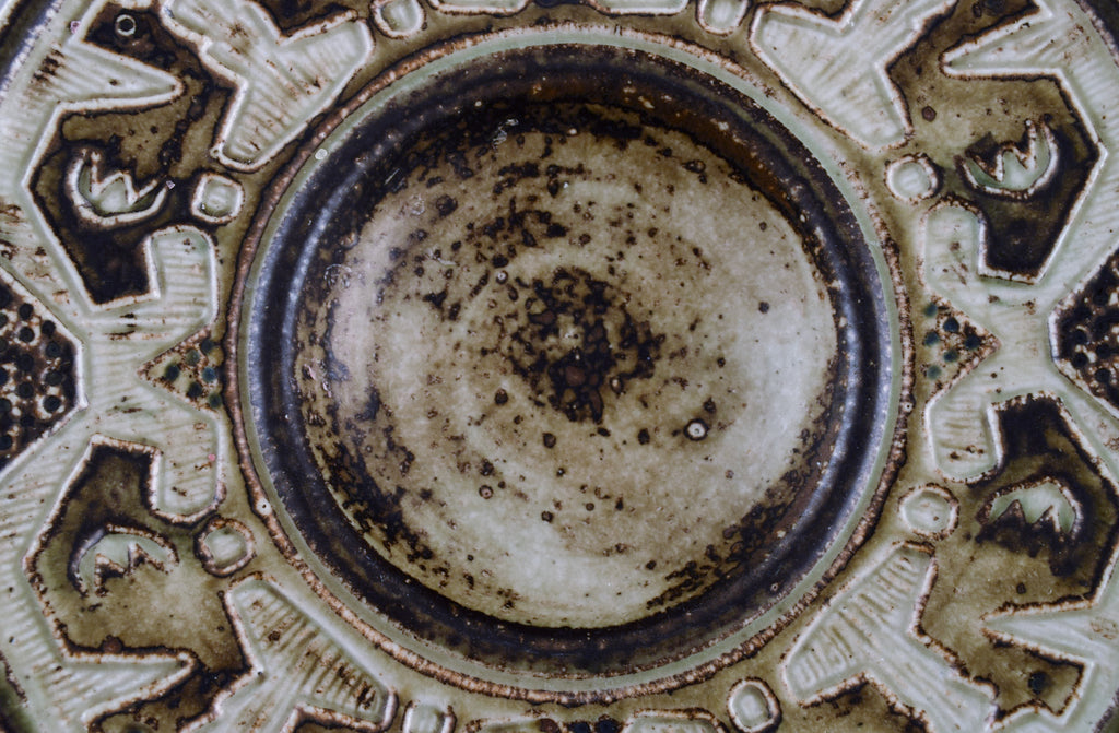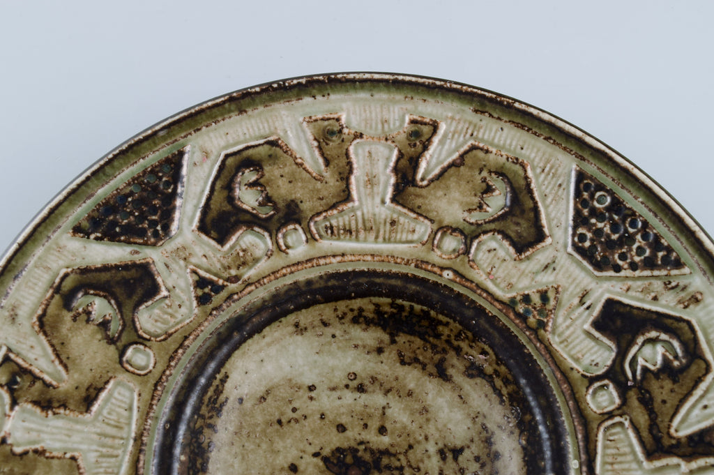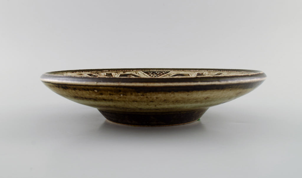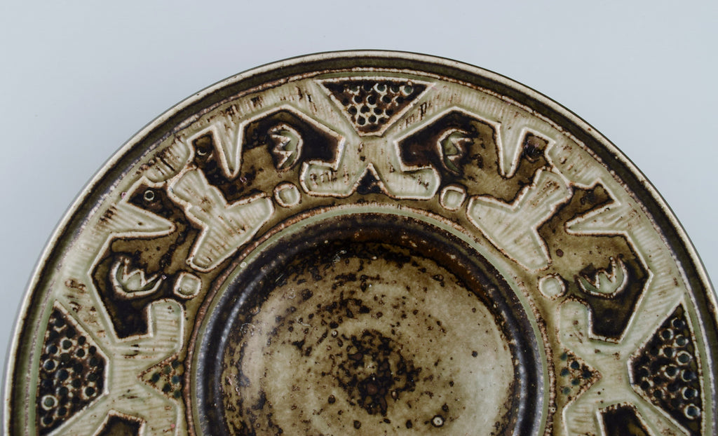 Jørgen Mogensen for Royal Copenhagen. Large bowl in glazed stoneware decorated with birds. Beautiful sung glaze. 1970s.
