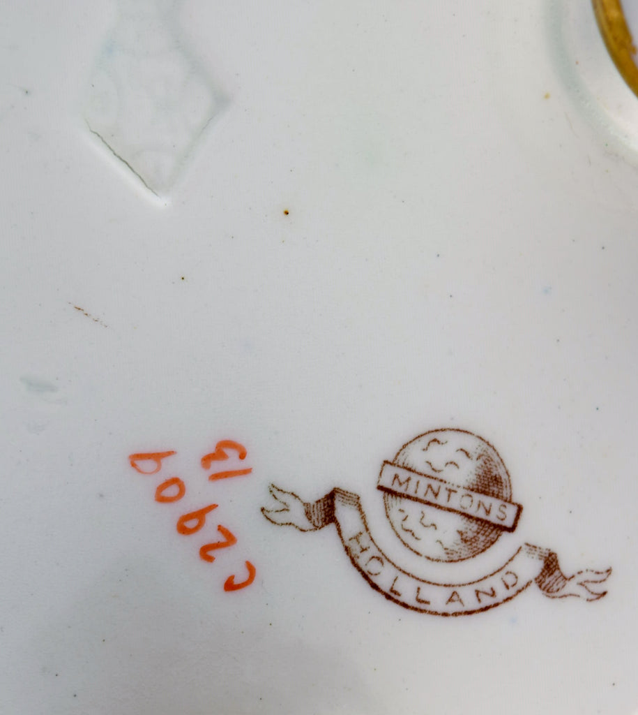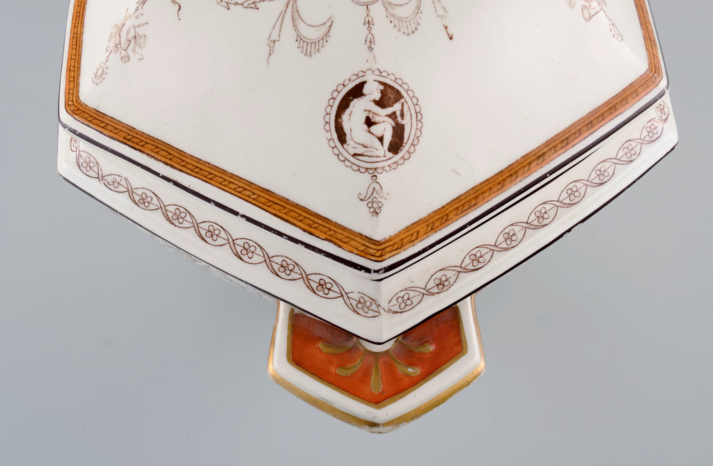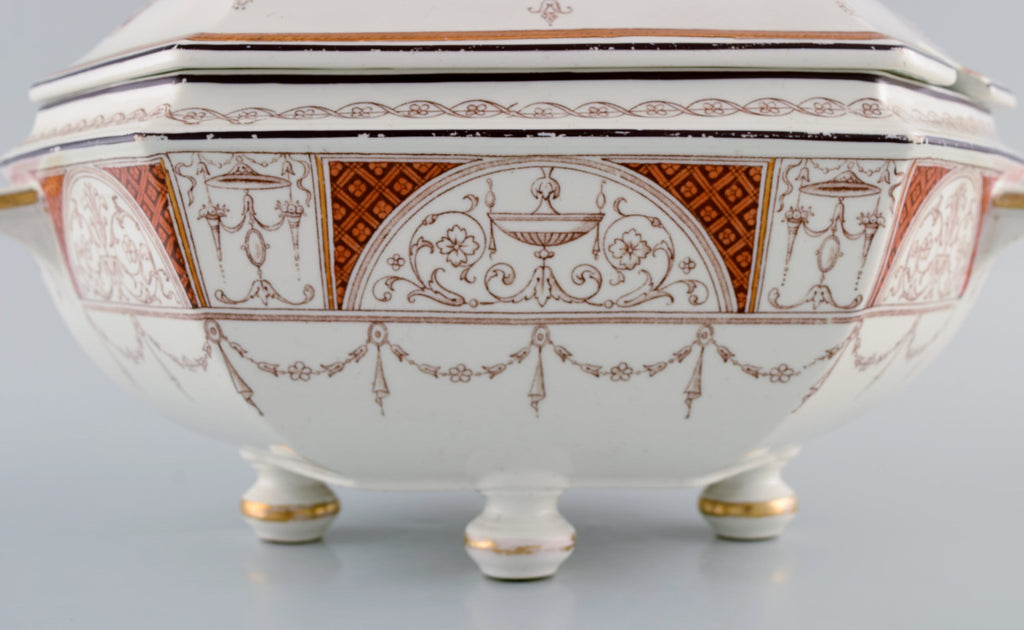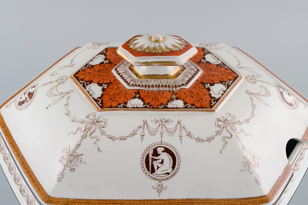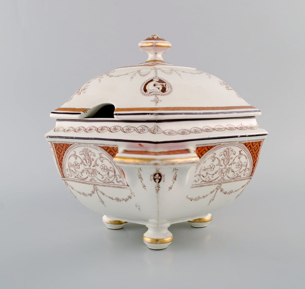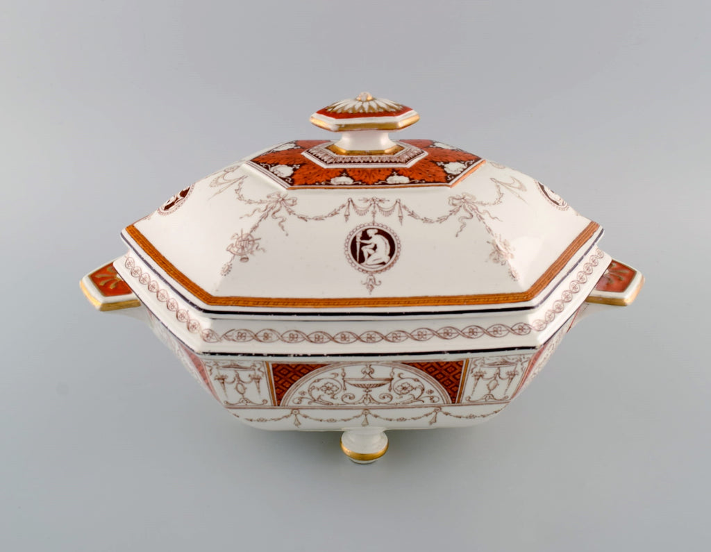 Mintons, England. Antique Holland lidded tureen in hand-painted porcelain. Classicist decoration and gold edge. Late 20th century.
